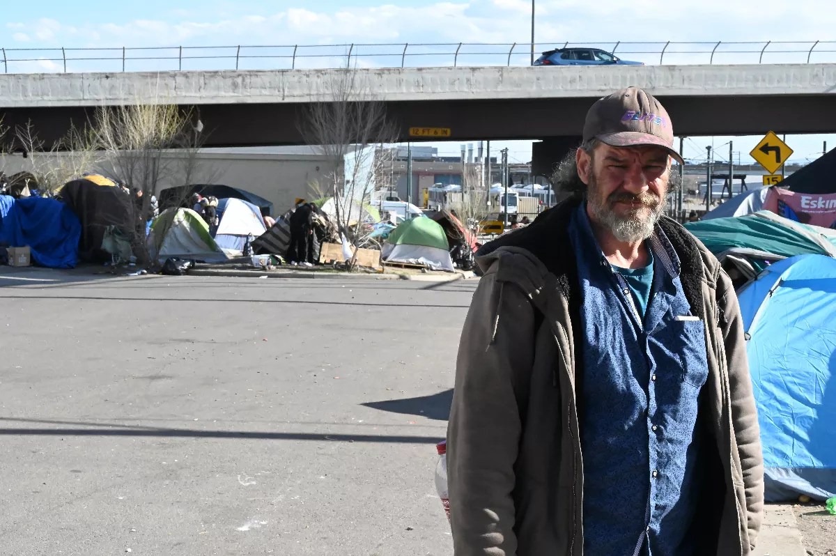 Rick Mitzen stands in front of the homeless encampment at Eighth Avenue and Navajo Street, where he lives with his wife.