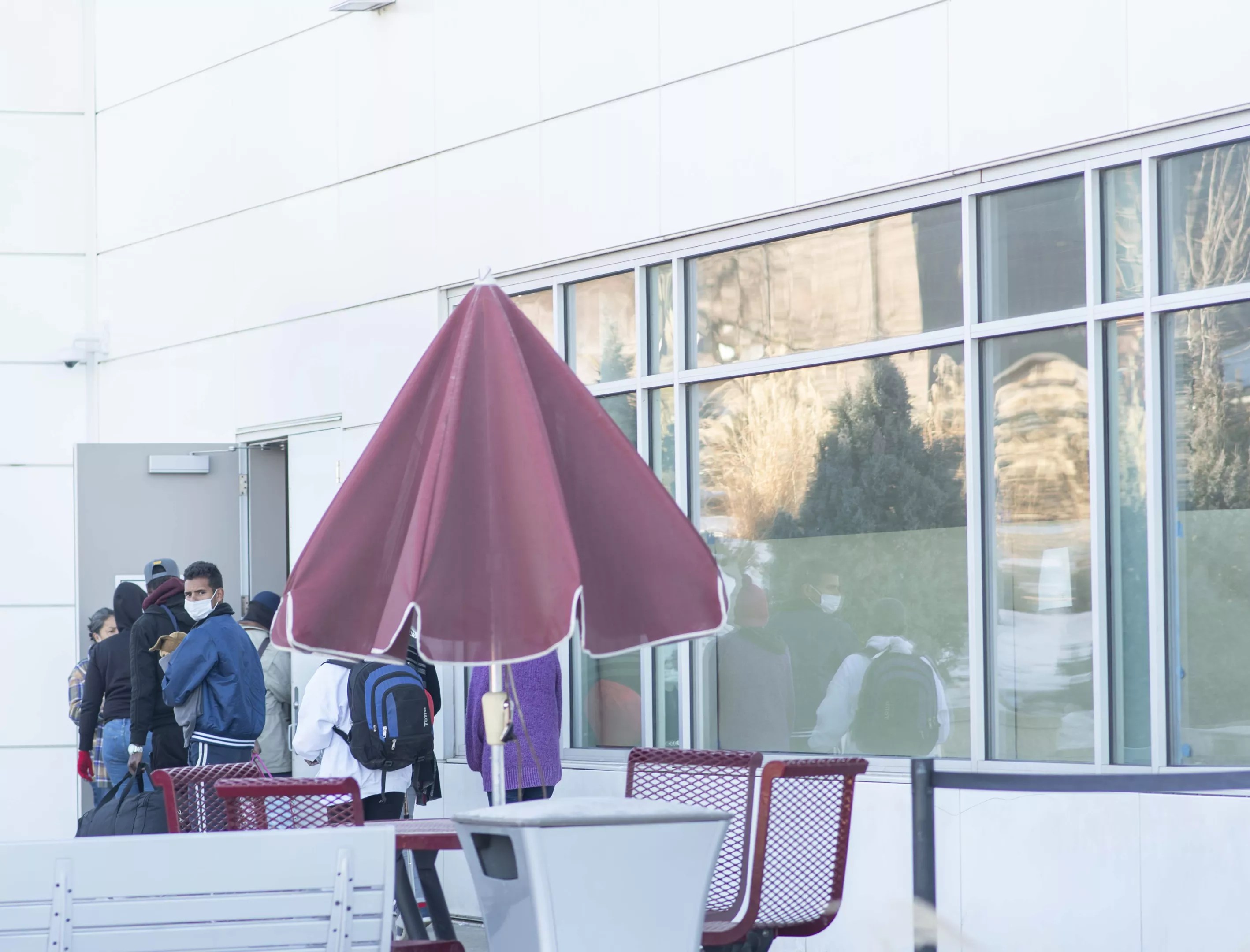 A line of migrants waited to enter the DHS building for the next phase of their journey.