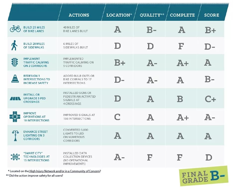 But there’s also this damning statement related to the deaths of 57 people in traffic accidents during 2020, when volume was lower than usual owing to the COVID-19 pandemic: “Despite the city’s improvement in their grades over time, traffic fatalities are not decreasing fast enough to hit the goal of zero fatalities by 2030.”