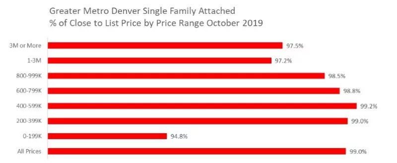 As for the top end of the scale, it sits at 100.1 percent – an indication of zip codes where the average was above list. That was the case in 80249, whose neighborhoods include Gateway and Green Valley Ranch. The prices there were among the most reasonable in the city, hovering around $300,000. But this stat demonstrates that the list there is mighty solid these days.