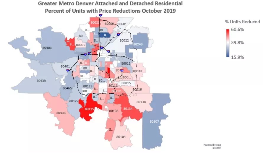 In the meantime, price reductions were more common during October than has been the case in many recent years. This graphic depicts zip codes where the lists were lowed in October – something that occurred from 15.9 percent to 60.6 percent of the time.