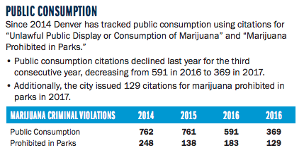 Despite the lack of places to consume marijuana in public, the report shows public consumption citations in Denver reached their lowest point in four years in 2017, falling over 50 percent since 2014, from 762 to 369.