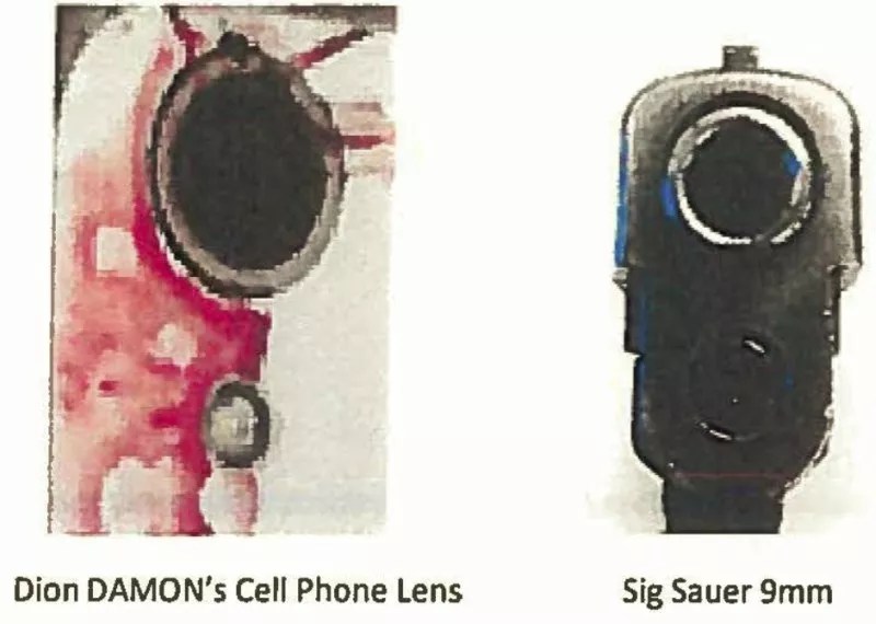 When it became clear no gun was present, the lawsuit accuses DPD investigators of going out of their way to concoct a theory that Motz could have confused the white cell phone for a black-and-silver semi-automatic. A prime example was a photo juxtaposition that likened the camera’s lens to the opening of a gun barrel – but to make the comparison believable, the former was significantly enlarged.