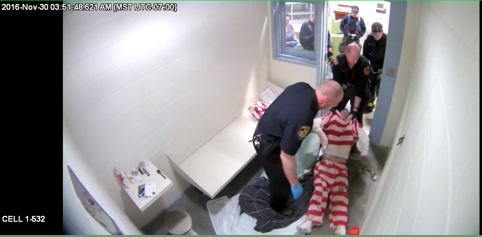 After Hartwell went into convulsions in his cell, the phone-in doctor ordered that he receive Keppra, an anti-eplieptic drug – but records don’t indicate that the medication was ever provided. One nurse informed the doctor by phone that Hartwell’s behavior “was inconsistent with seizures” – at the same time that surveillance video shows him having seizures. (A few weeks ago we wrote about a similar case of misdiagnosis in the case of Justin Stieb, an inmate who died in his Delta County cell in 2014.) “Mr. Hartwell’s condition was obviously too complex to be managed over the phone,” the lawsuit states, “as evidenced by the failure to control his hypertension and diabetes for over two weeks, and he was at substantial risk of intracranial hemorrhage, stroke, and death.”