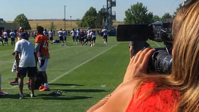 Denver7 weekend sports anchor and reporter Alison Mastrangelo acting as her own photographer – something that’s become much more common.