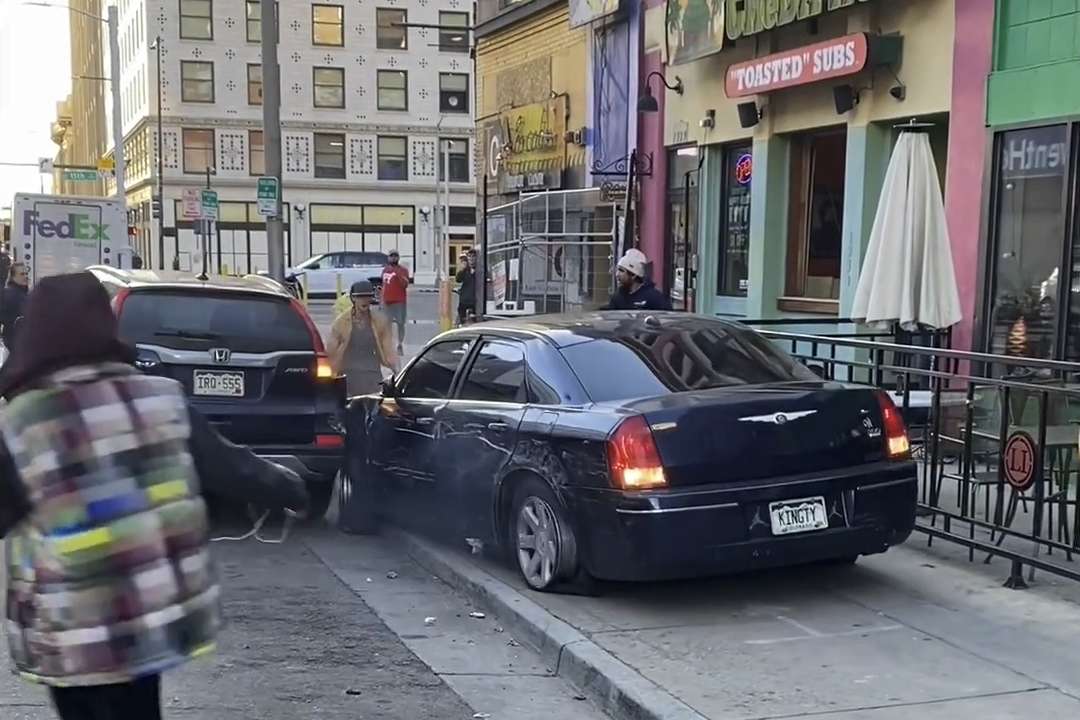 At one point, a passenger gets out of the car to try to help navigate, yelling at bystanders to stop taking videos as the driver gets stuck between the construction fence and the patio seating area of Modern Market.