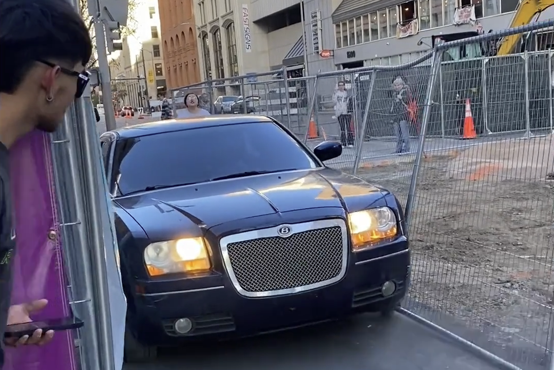 At one point, a passenger gets out of the car to try to help navigate, yelling at bystanders to stop taking videos as the driver gets stuck between the construction fence and the patio seating area of Modern Market.