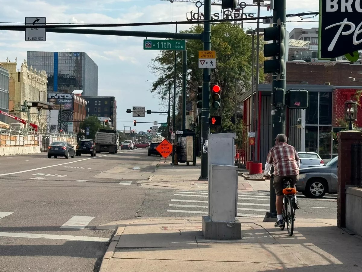 X user @TomDorsa wrote that in Lower Downtown, the bike lane that goes along Blake Street “abruptly swings all the way across 17th Street in the most dangerous fashion imaginable.”