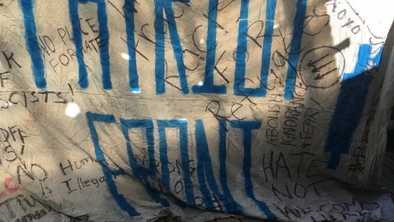 The seized Patriot Front banner, now covered with anti-fascist messages.