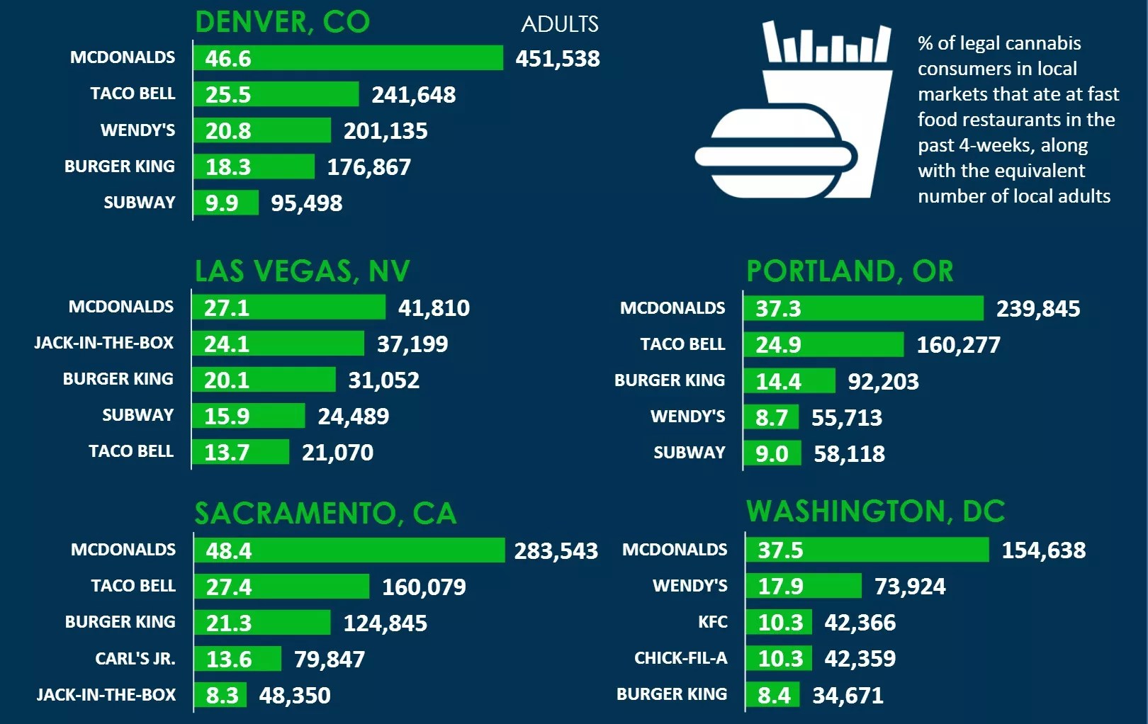 Surveying the eating habits of dispensary visitors in five cities with legalized cannabis – Denver, Las Vegas, Portland, Sacramento and Washington, D.C. – the study found that McDonald’s still reigns supreme among the stoned crowd. Taco Bell, Wendy’s, Burger King and Subway filled out the top five nationally; Arby’s, Chick-Fil-A, Jack in the Box, Kentucky Fried Chicken and Carl’s Jr. rounded out the top ten.
