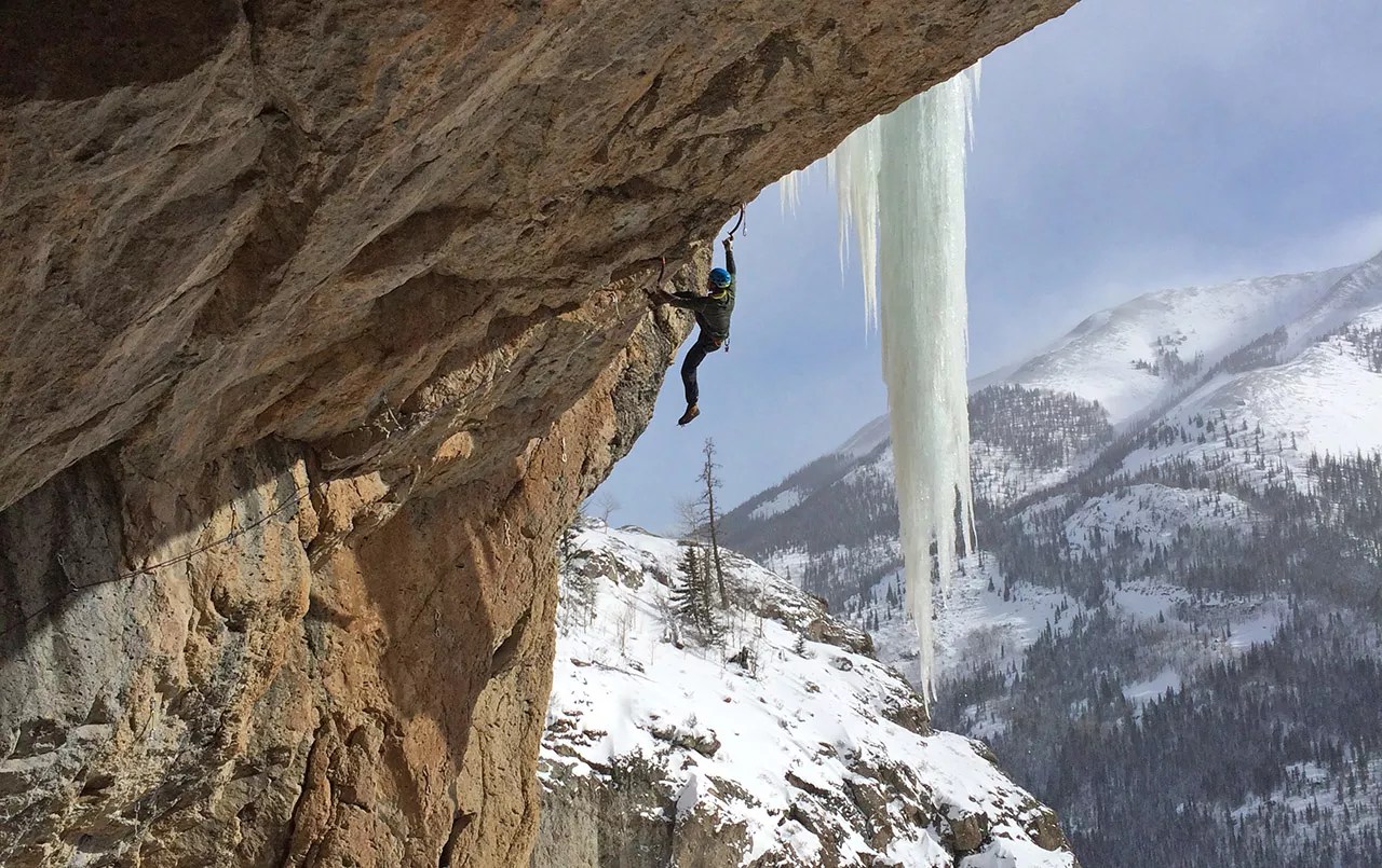 Back in Colorado, Keenan resumed training for sport climbing and bouldering competitions at Earth Treks Golden. But he was soon feeling antsy. “I wanted to spend more time training for ice climbing,” Keenan says – so Gross, his coach, encouraged him to shift his focus to dry tooling, a form of rock climbing in which ice axes are used to climb rock that’s not covered in snow or ice.
