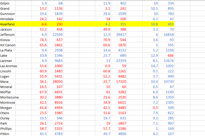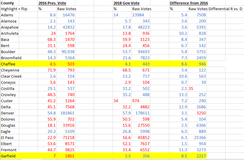 Spreadsheets are fun! The left-hand columns show the 2016 Trump/Clinton margin of victory by county and the raw vote margin, with the party winner indicated by color (blue for a Clinton/Democratic win, red for Trump/Republican). The middle two columns are the Polis/Stapleton margins. The right two columns indicate the net differential from 2016 to 2018. Highlighted county = shifted from a Trump victory to a Polis victory.