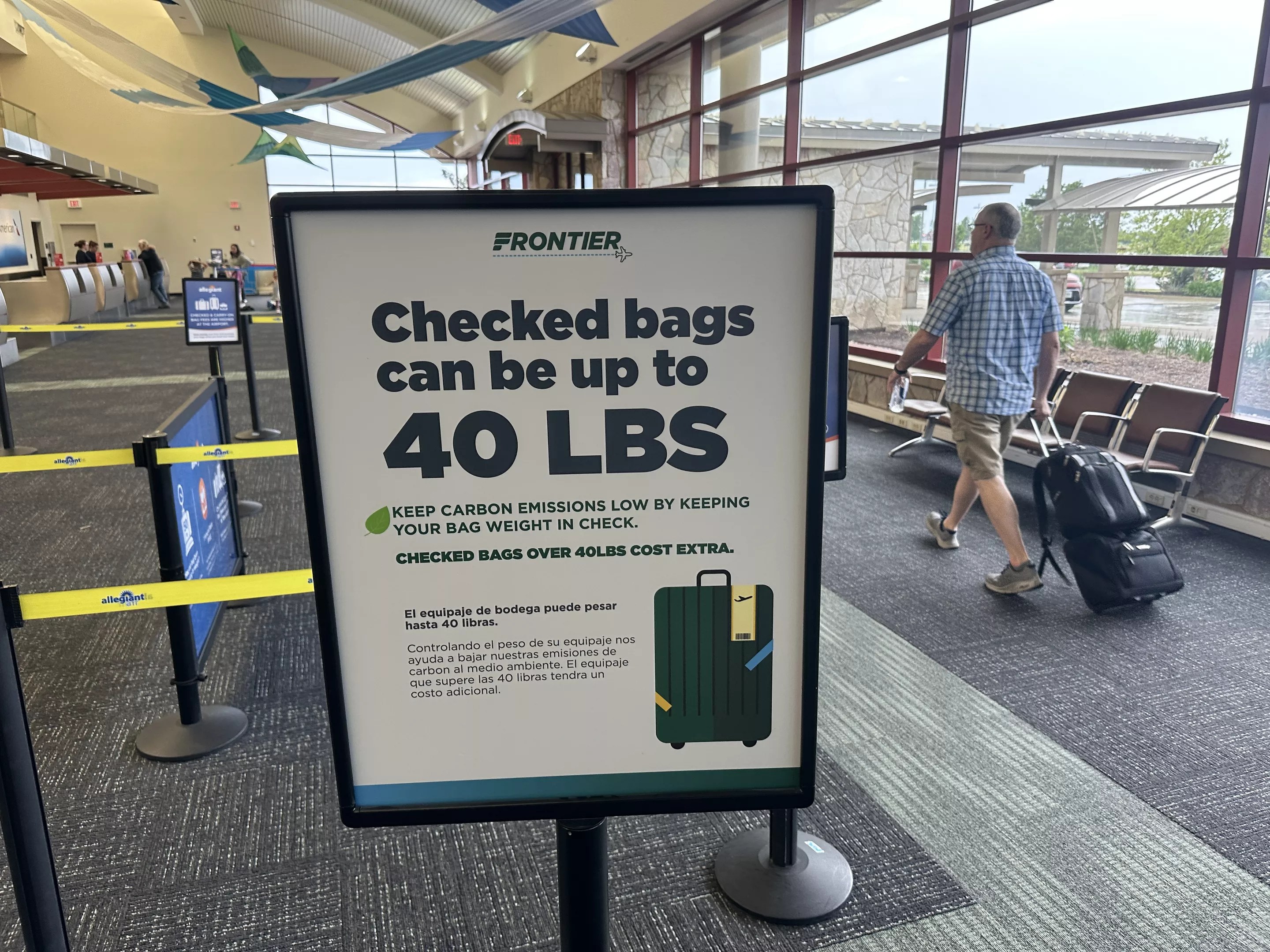 And speaking of bags, Frontier, a couple of things: A forty-pound max weight on a bag is stupid-low, especially at your pricing. It doesn’t seem like much, but I saw several people in check-in having to unpack enough of their suitcases to make that forty-pound limit, and it’s clear this was meant to force people to pay for an equally inflated second bag. These aren’t “frills.” Being able to get sufficient underwear to my destination should not be a perk.