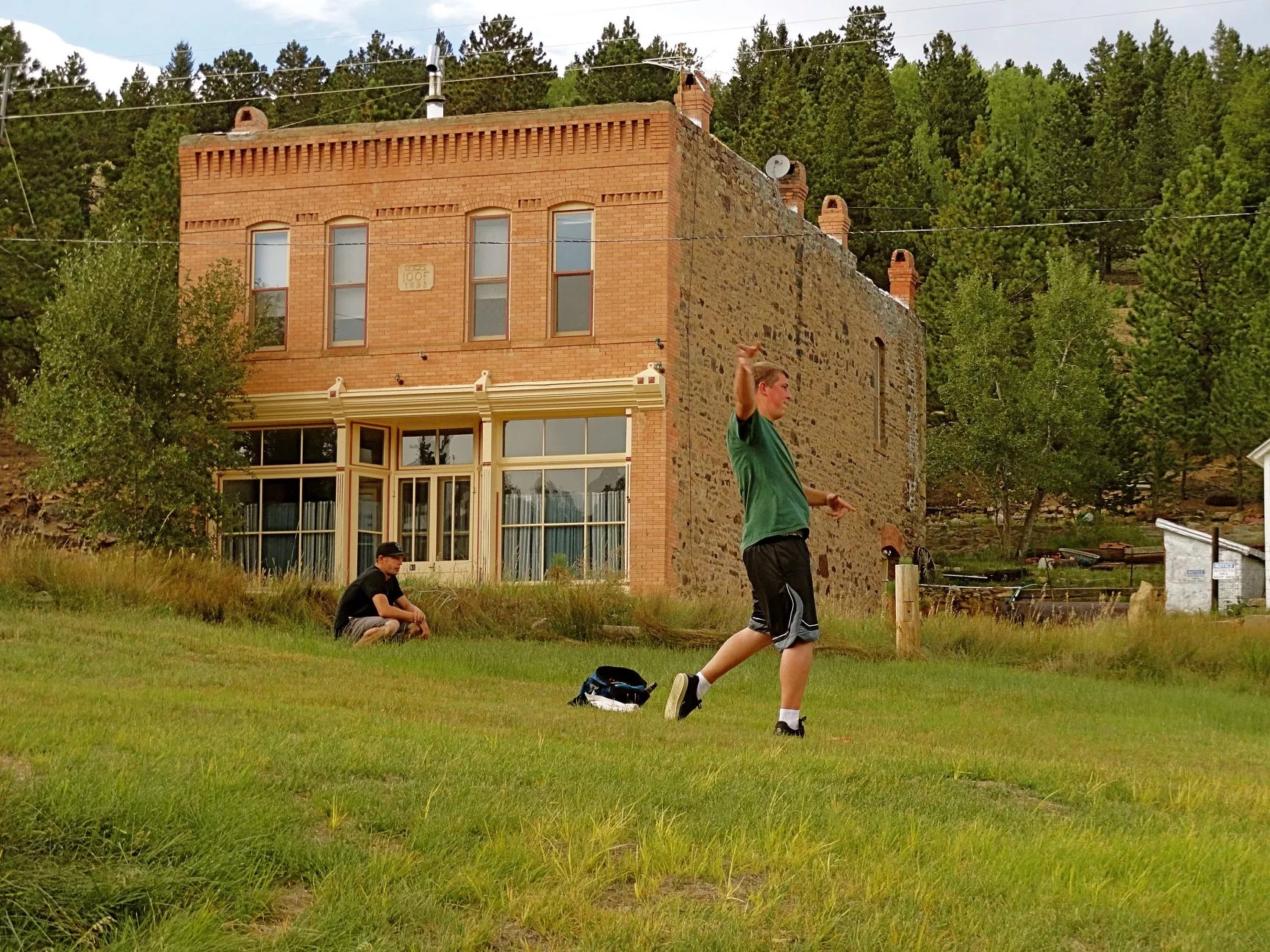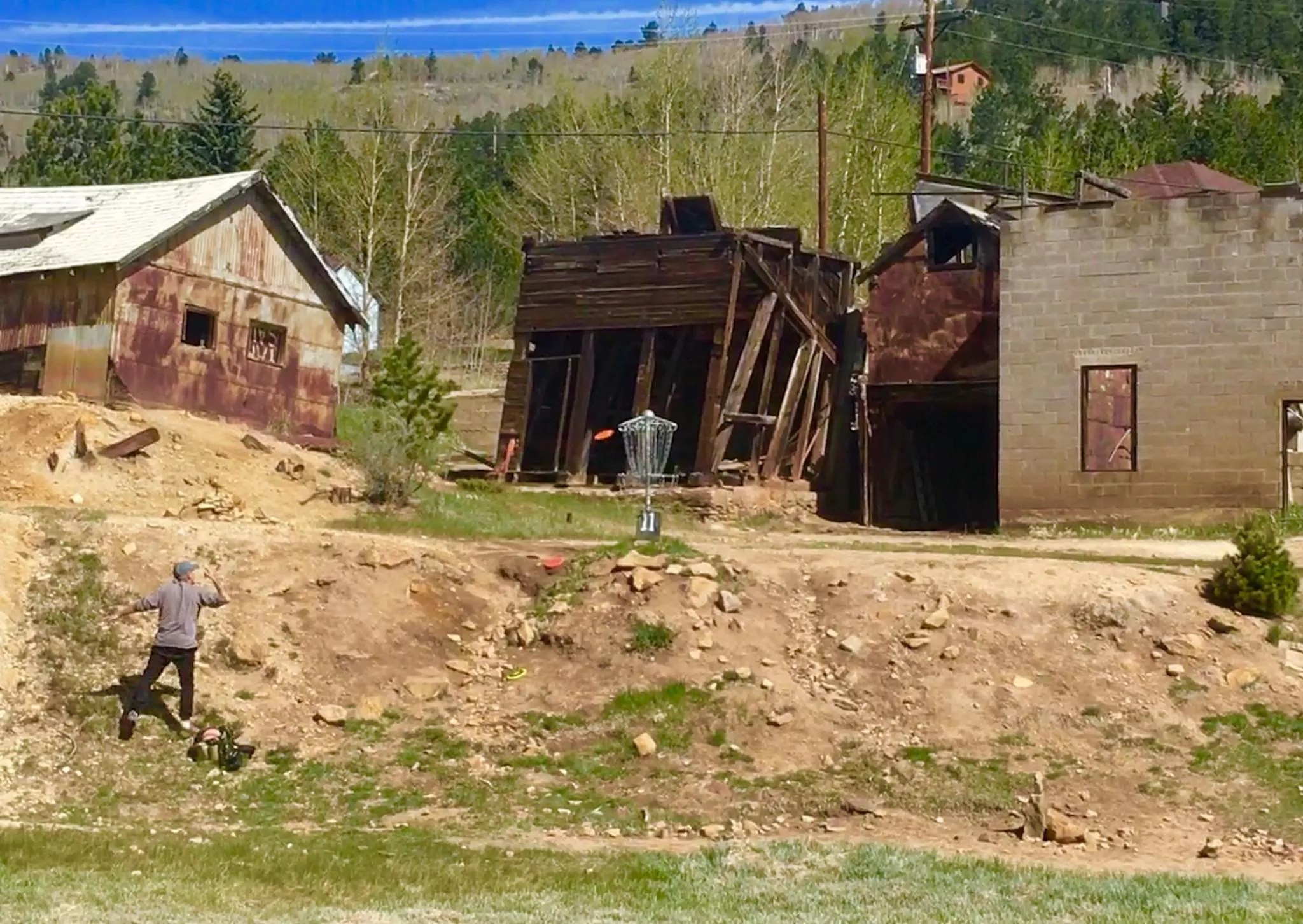 Ghost Town Disc Golf (aka GTDG) is one of about three dozen pay-to-play disc golf courses in a state that has nearly 300 free courses – about a third of which are located in the mountains, according to the Professional Disc Golf Association. It also happens to be the O’Donnells’ home, eighteen acres that host a handful of mining town-era buildings in various stages of ruination, all tucked into the craggy, steep terrain straddling Russell Gulch at 9,150 feet, less than ten minutes from Idaho Springs to the south (along the infamous Oh My God Road), and even closer to Central City and Black Hawk to the north.