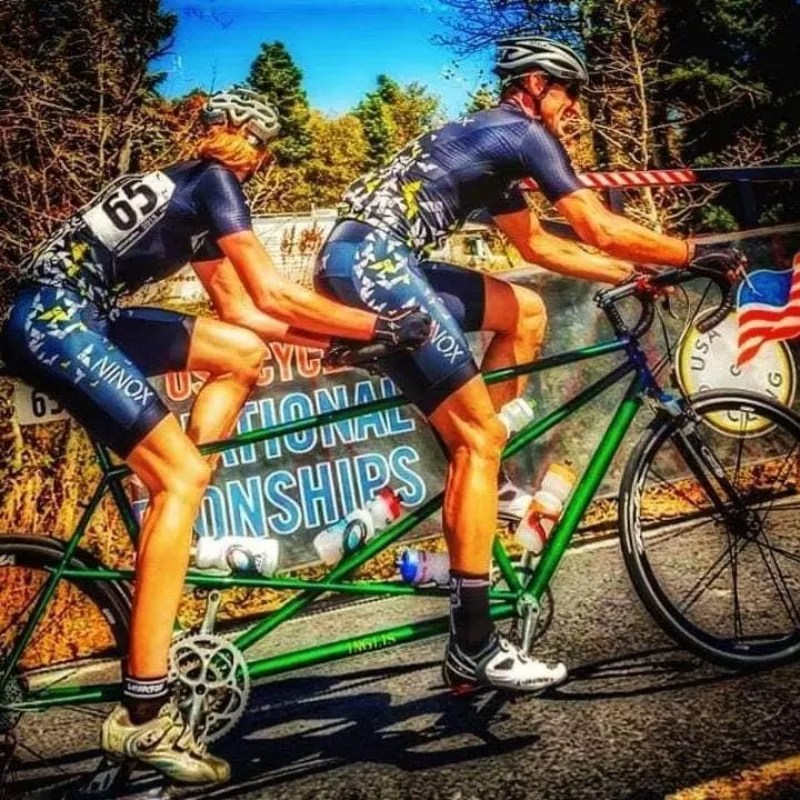 Gwen and Michael Inglis on a tandem bicycle.