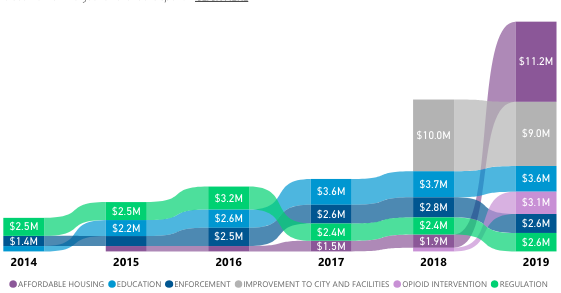 From 2014 to 2019, about $29 million of the city’s pot tax revenue was spent on marijuana regulation and enforcement, according to Excise and Licenses; youth prevention got $16 million during the same period. Those were the only three areas outside of the general fund earmarked for marijuana tax revenue until 2017, when affordable housing ($16 million from 2017 to 2019), opioid intervention ($3.1 million in 2019) and city capital improvements ($19 million from 2018 to 2019) all came in for their cuts.