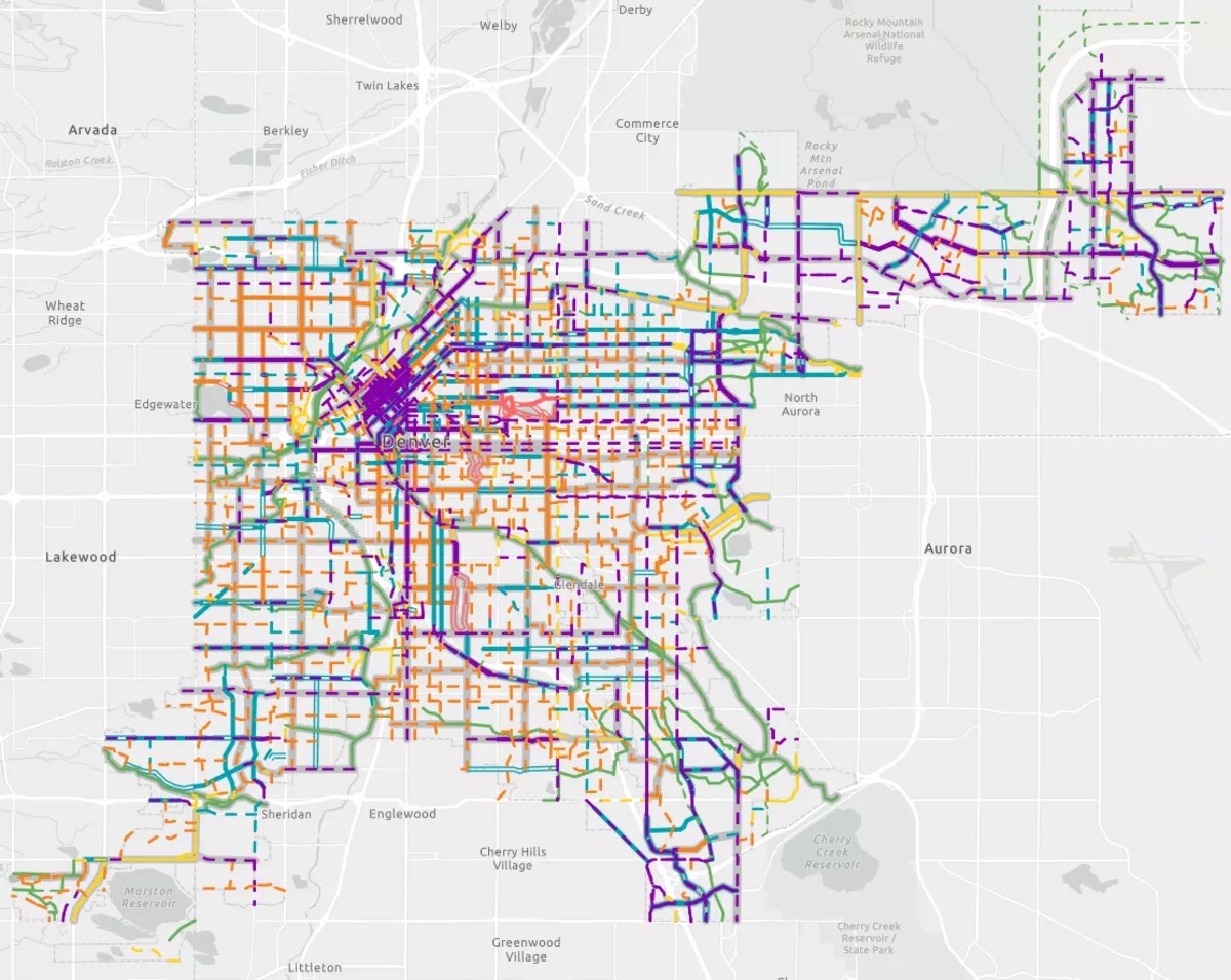 Denver’s most recent bike map, released in June. Dotted lines show improvements the City of Denver hopes to make over the next twenty years.