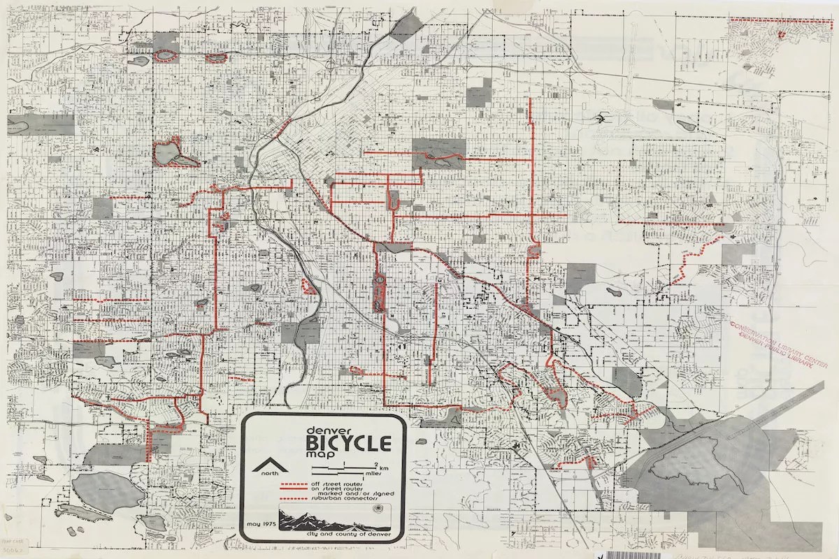 A 1975 map of Denver’s bicycle routes published by the city suggests that Denver cyclists have been dealing with the same challenges for a long time, but it was a much more limited experience back then.