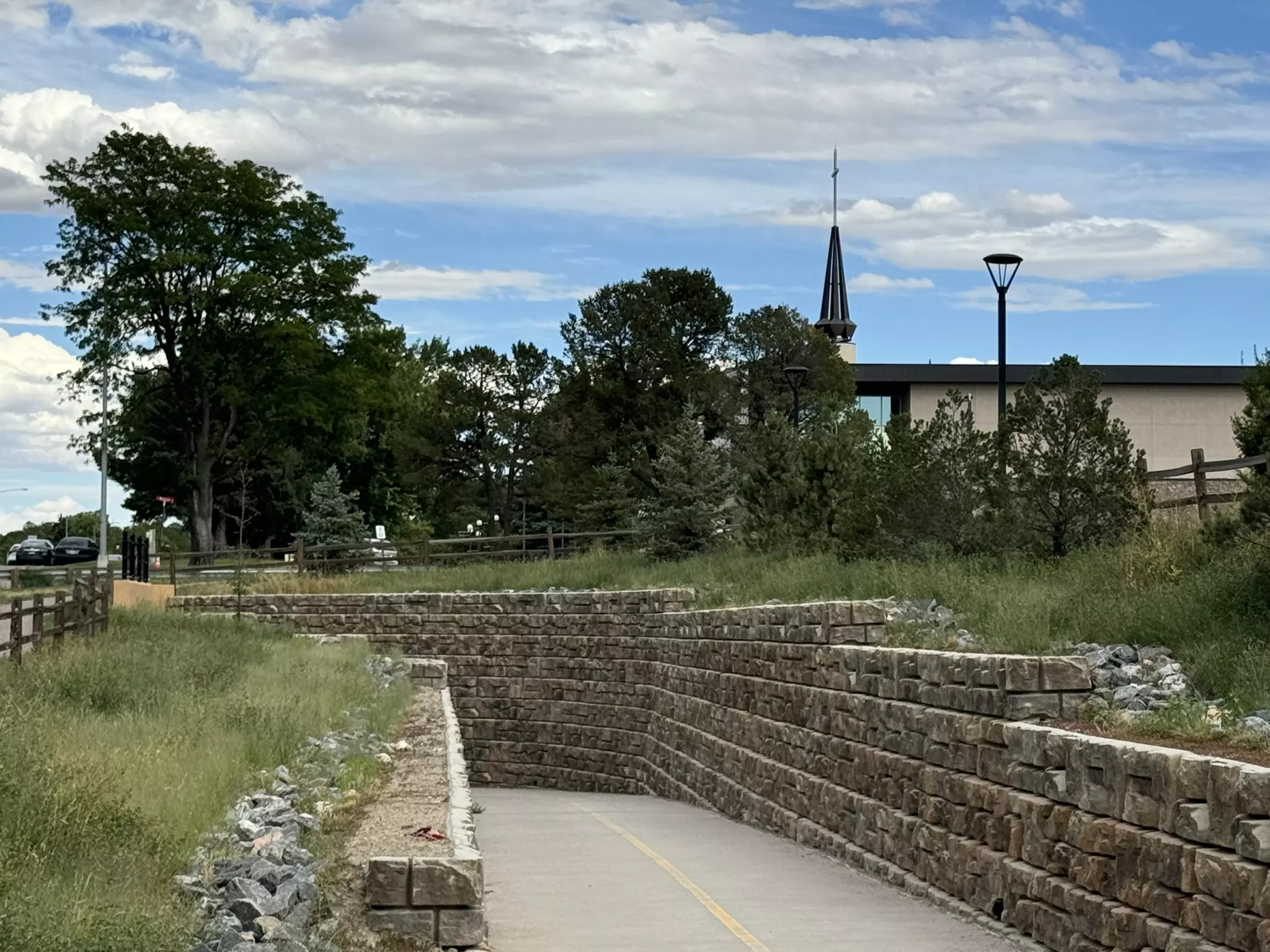The High Line crosses Highway 285 in Cherry Hills Village with a stone-walled underpass.