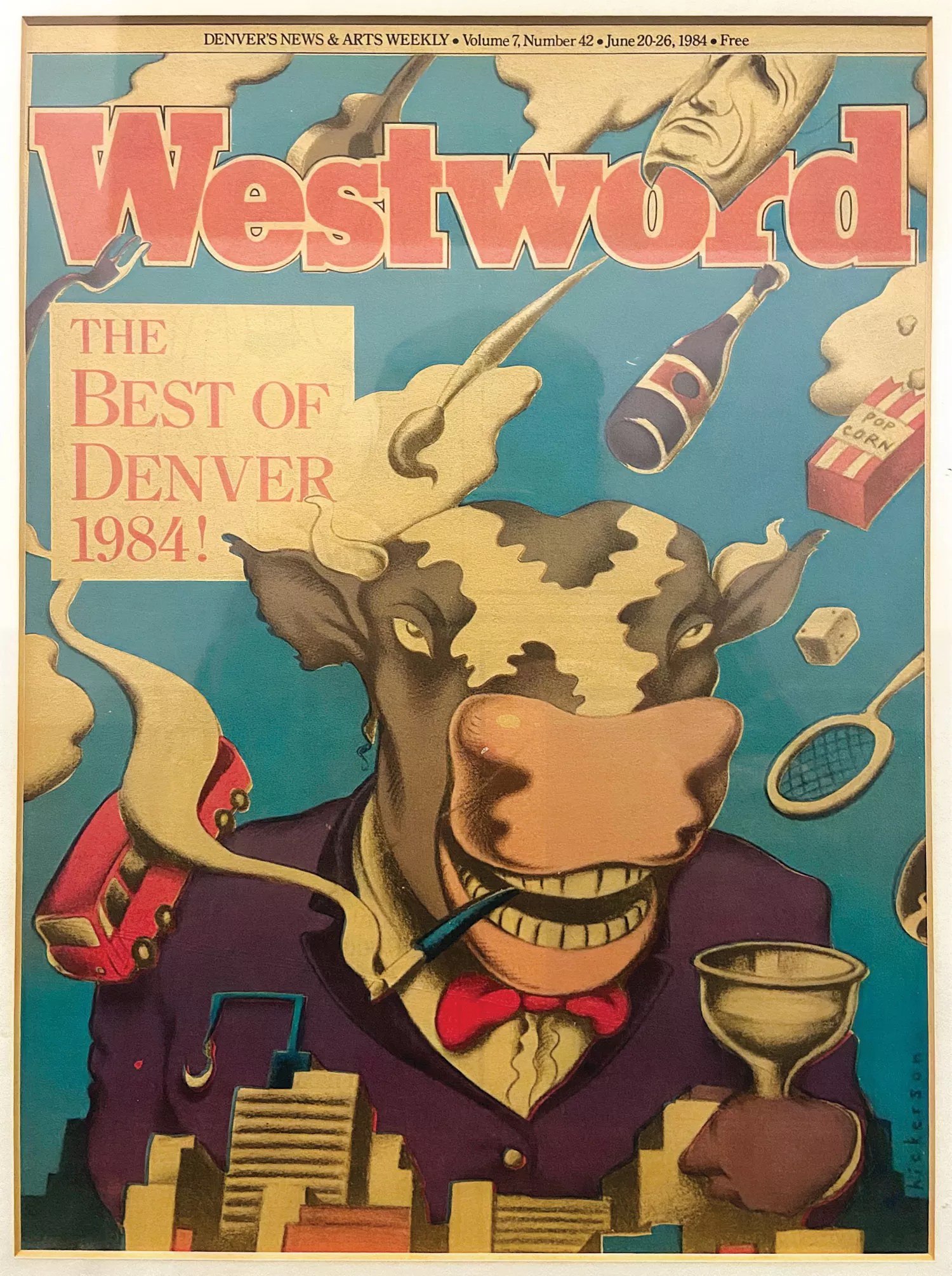 As Westword‘s first Music/Culture Editor, I worked on that inaugural Best of Denver issue, and on many editions after that. Pulling together that first Best Of was like a license to be a know-it-all; we knew what we liked about the city, and this was our chance to share it with awards created for the very best people, places and things we’d found in Denver. The results were crammed in a huge (for the time) issue of 88 pages, with a fantastic full-color cover illustration by Buddy Hickerson of a classy cow in a tux holding a wine glass, looming over Denver’s skyline.