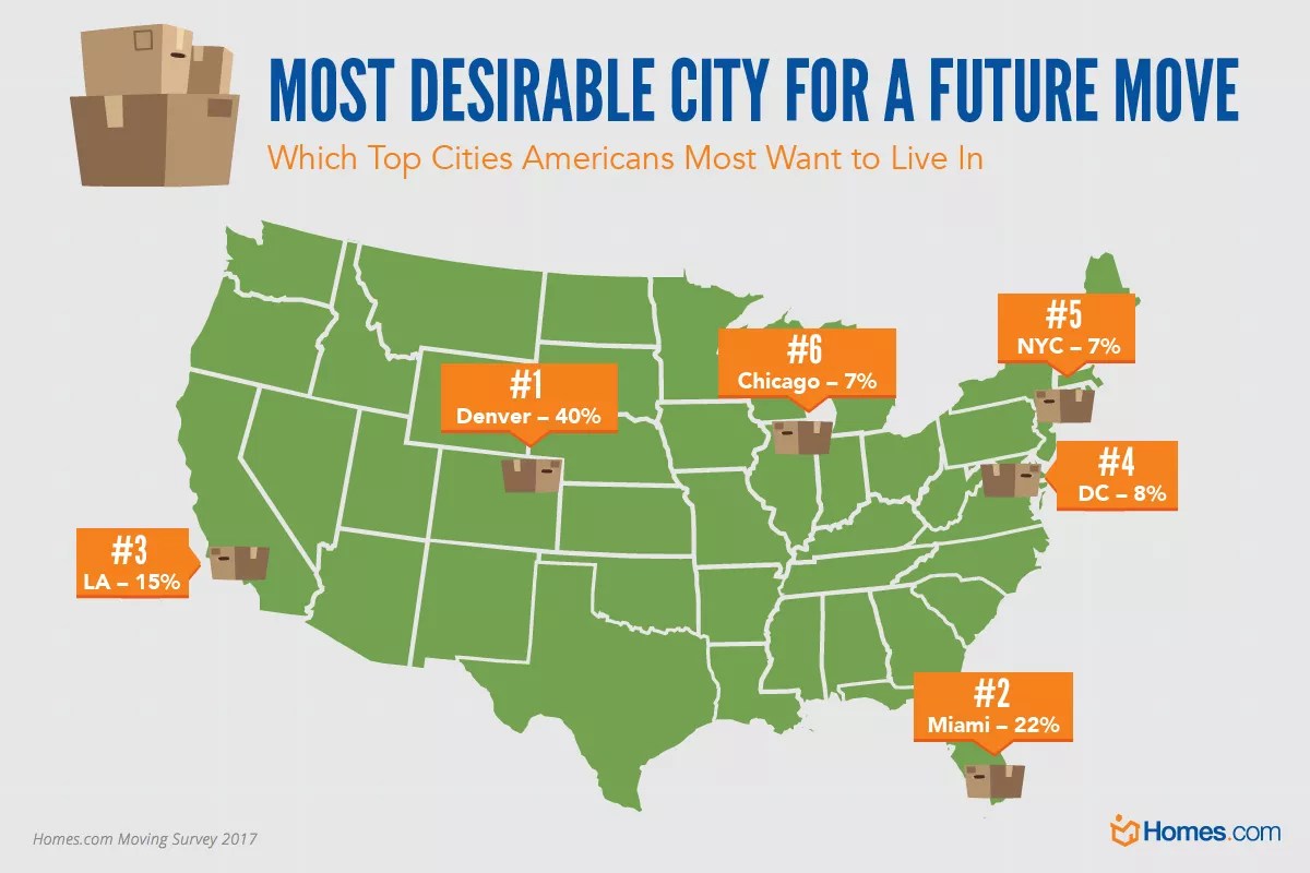 Choosing between six major U.S. cities – Denver, Los Angeles, New York City, Chicago, Washington, D.C., and Miami – 40 percent of respondents (a full 18 percentage points over the runner-up, Miami) said that they’d most want to move to Denver.