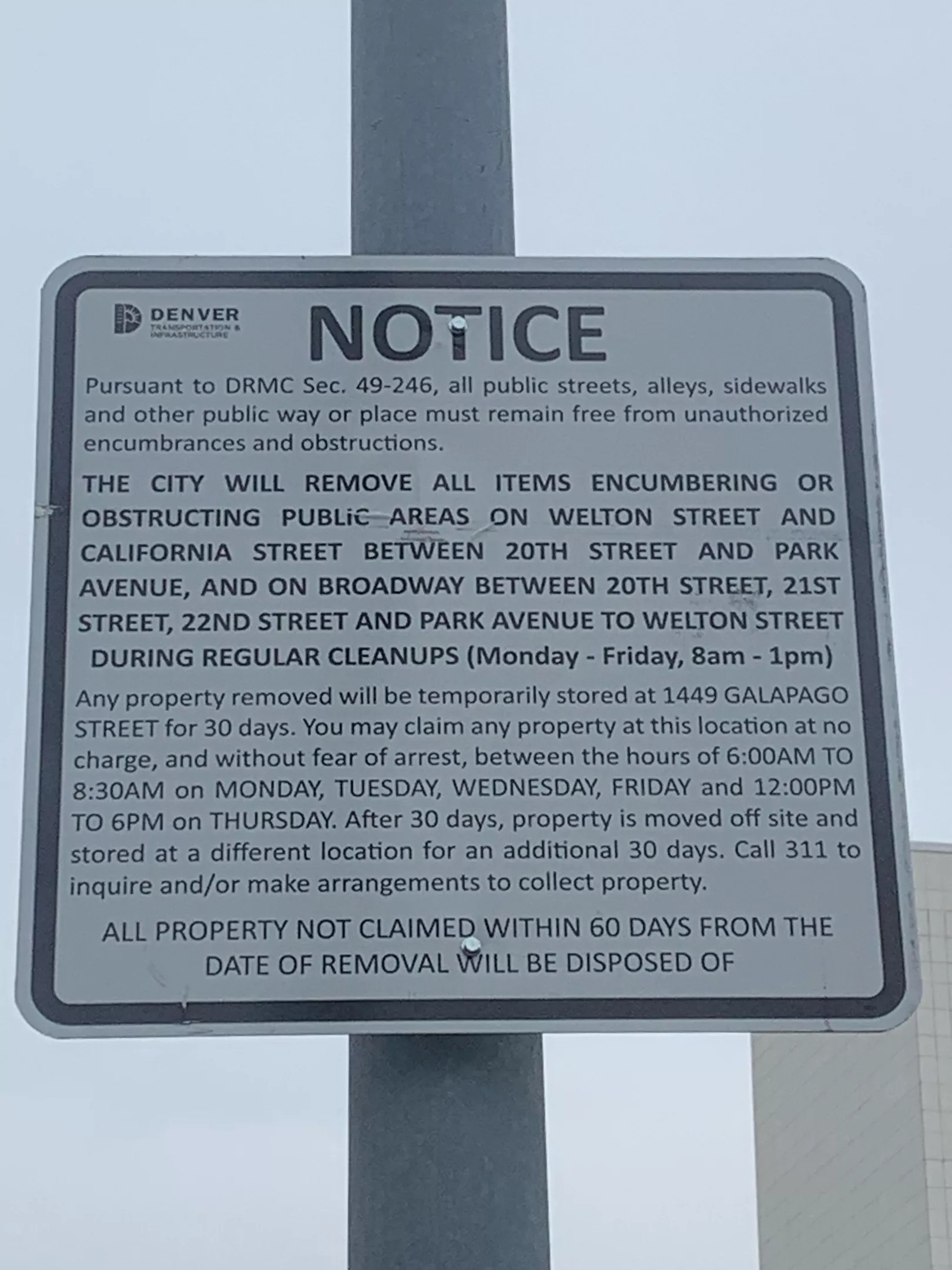 In late September, the city decided to set up permanent signage in a multi-block area bounded by Broadway, Park Avenue, Welton Street and 20th Street that announces the city will be conducting “regular cleanups” to remove encumbrances on the public right-of-way. This right-of-way ordinance is one of the primary laws the city cites when justifying an encampment sweep, and it now appears on multiple signs in the downtown/Five Points area.