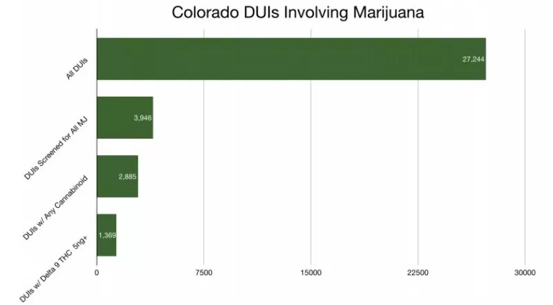 These numbers are correct, but they lack the context provided a couple of paragraphs later. There were actually 27,244 court cases involving at least one DUI charge in Colorado circa 2016. Of that total, just 3,946 individuals were screened for marijuana, presumably because law enforcers had reason to believe the drivers in question had partaken. That explains why a significant 2,885 individuals tested positive for cannabinoids. But as noted above, fewer than half of them – 1,369 – showed any evidence of Delta 9 THC, suggesting that a far smaller number were actually impaired.