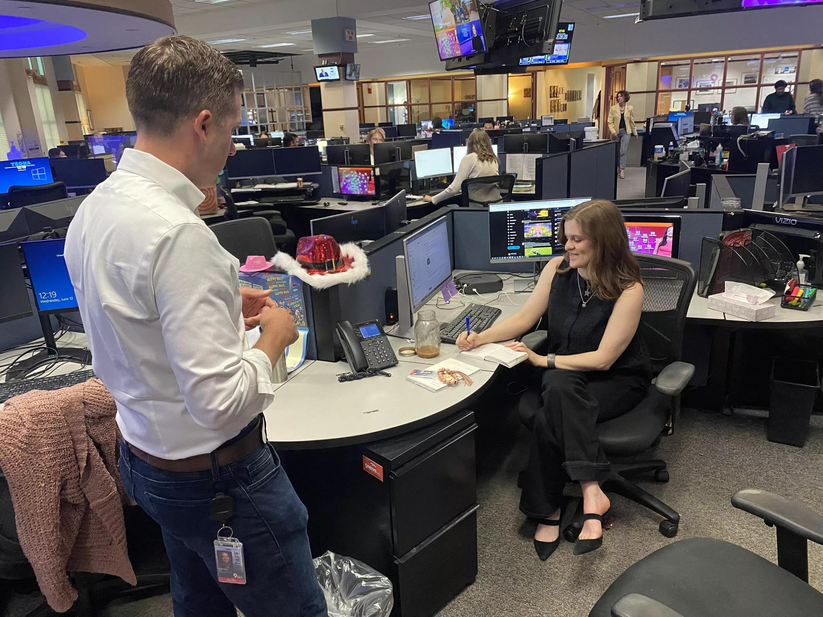 Producer Mallory Harris and Kyle Clark plan the day’s edition of Next.