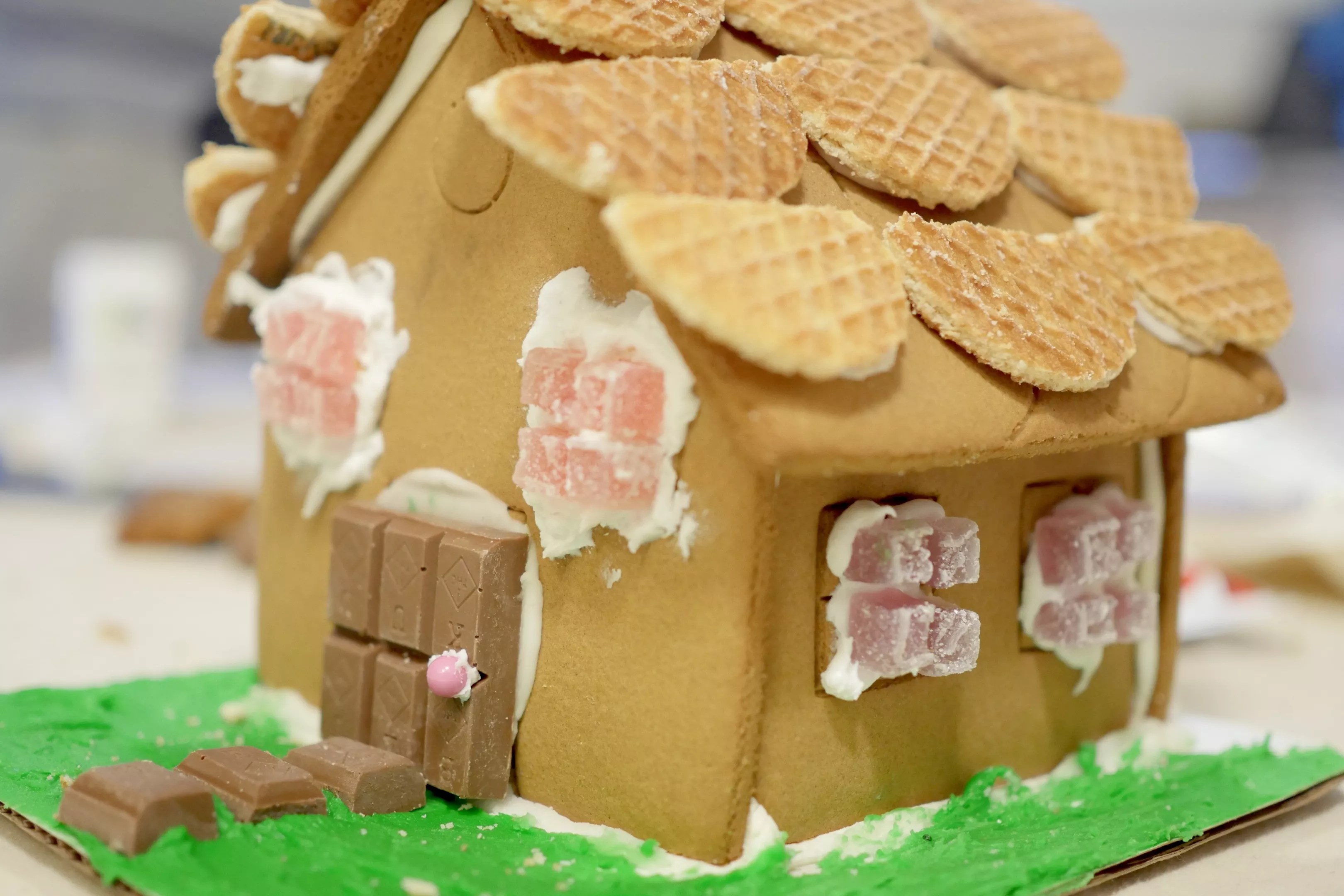 Just make sure you have enough frosting to cement the decorations, and then caulk away. Lollipops were obvious trees, while the stroopwafels made great cottage tiles.