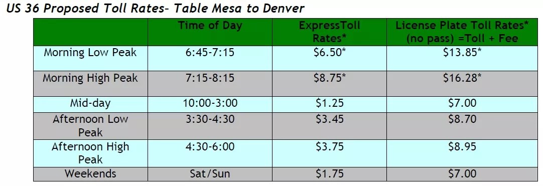 For more details, click to access the Colorado Department of Transportation document “2017 Proposed Toll Rate Adjustment for US 36 and I-25 Central Express Lanes.”