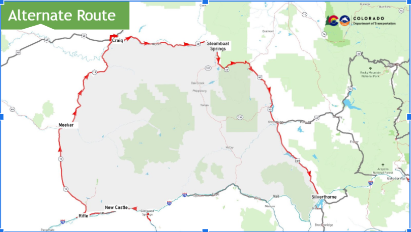WESTBOUND I-70: Motorists coming from the Denver metro area or Interstate 25 can travel westbound on I-70 to Silverthorne, then turn north onto CO 9. In Kremmling, travelers should turn onto westbound US Highway 40 towards Steamboat Springs. After reaching Craig, motorists can return south via CO 13 towards Rifle. Access to I-70 westbound is at Rifle.