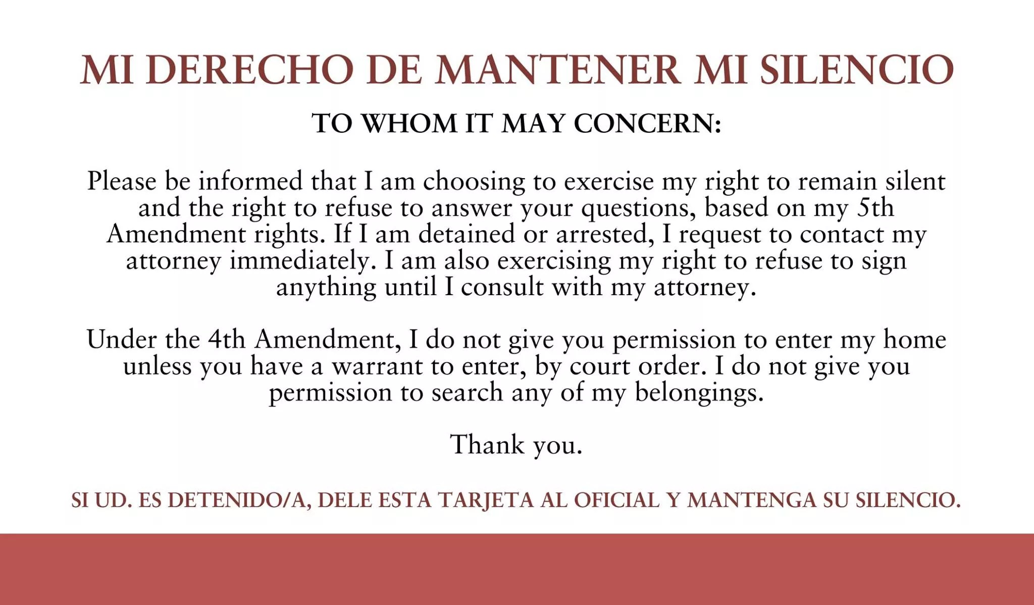 In order to prepare for any such encounters, Gonzales handed out business cards that people can hand to ICE agents that assert their right to remain silent: