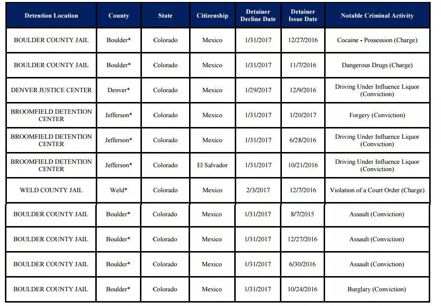 According to the report, 206 out of 3,083 detainer requests across the country that week were not honored, and they included jails in four counties in Colorado: Denver, Boulder, Jefferson and Weld.