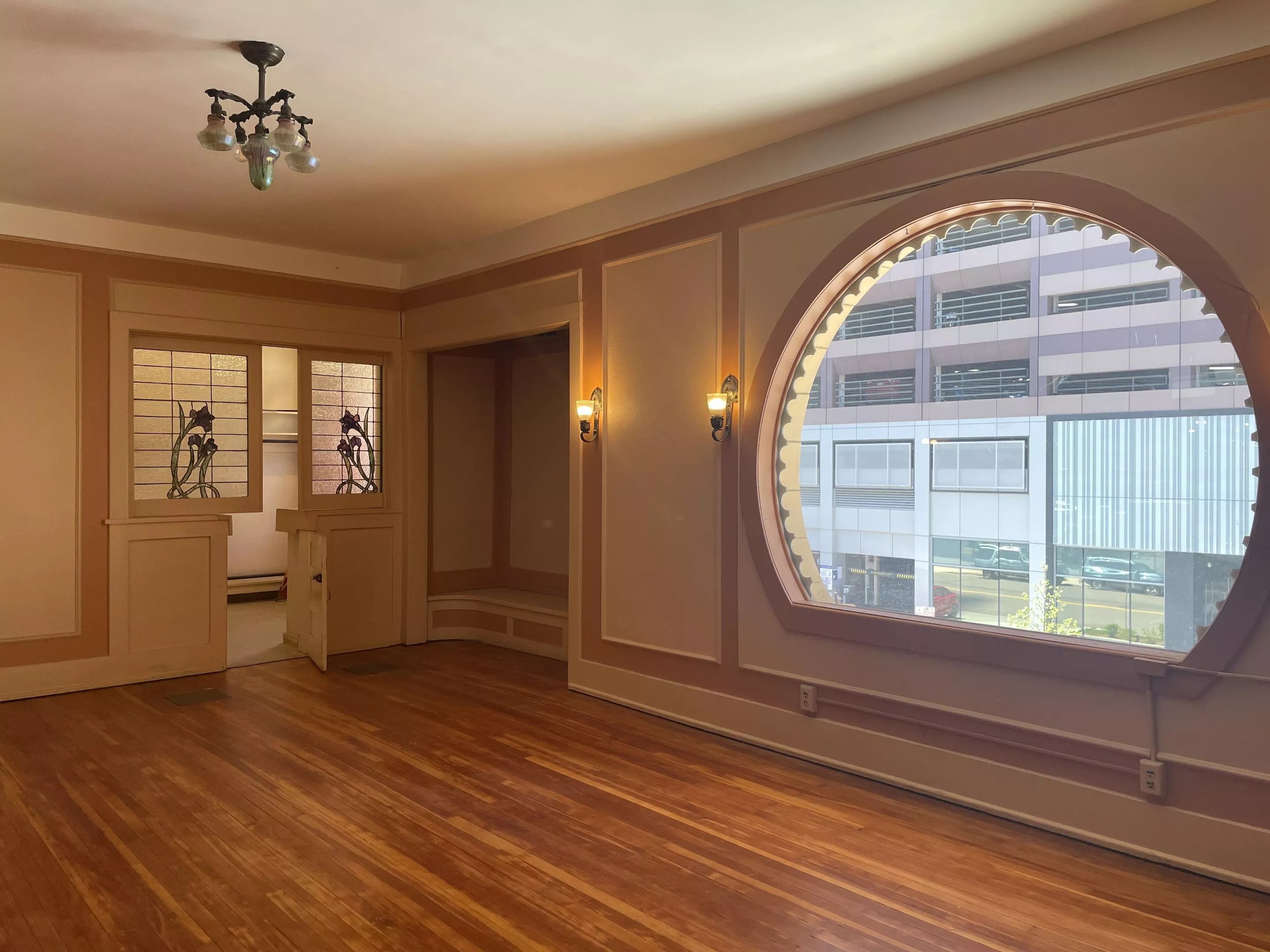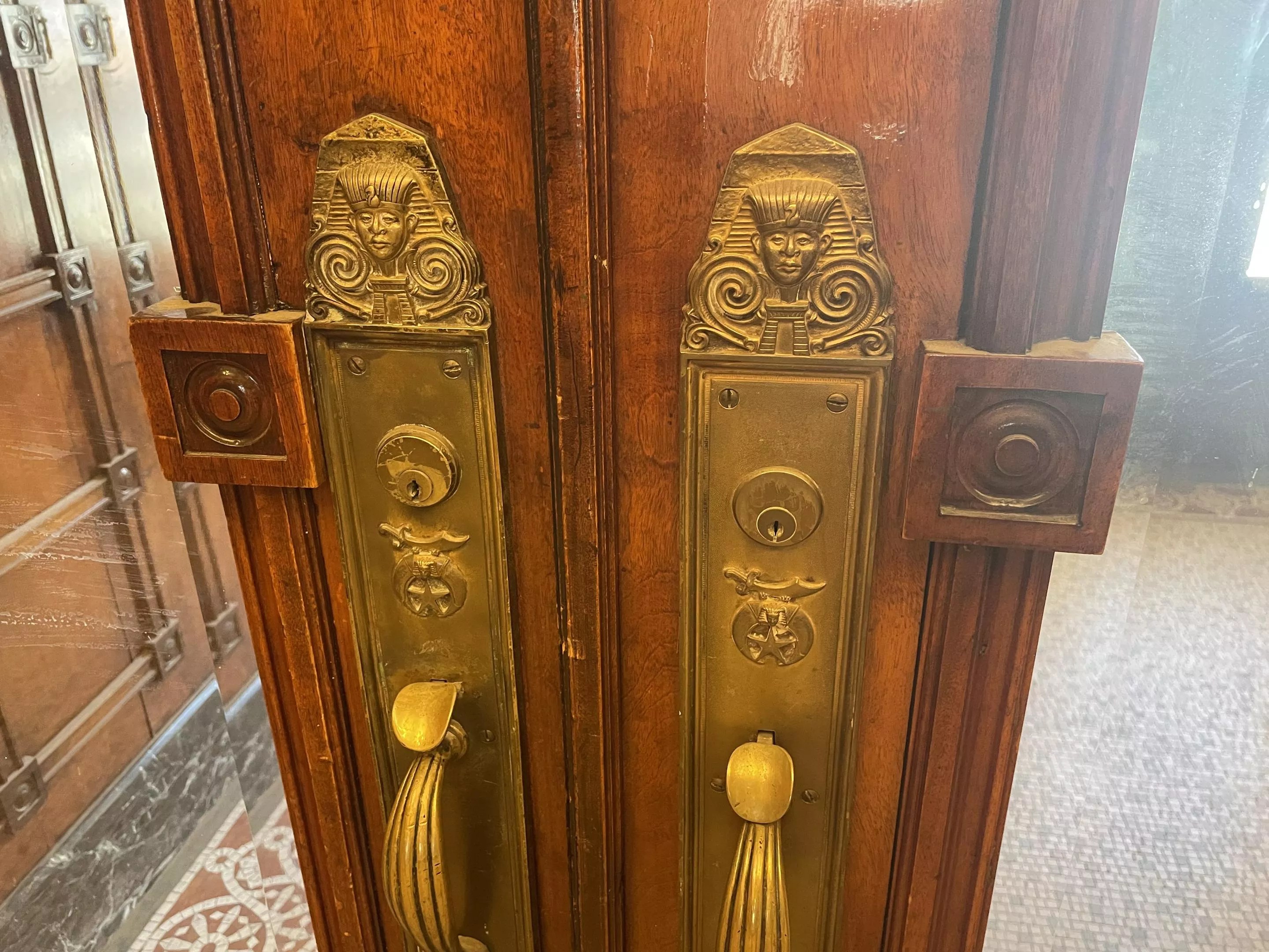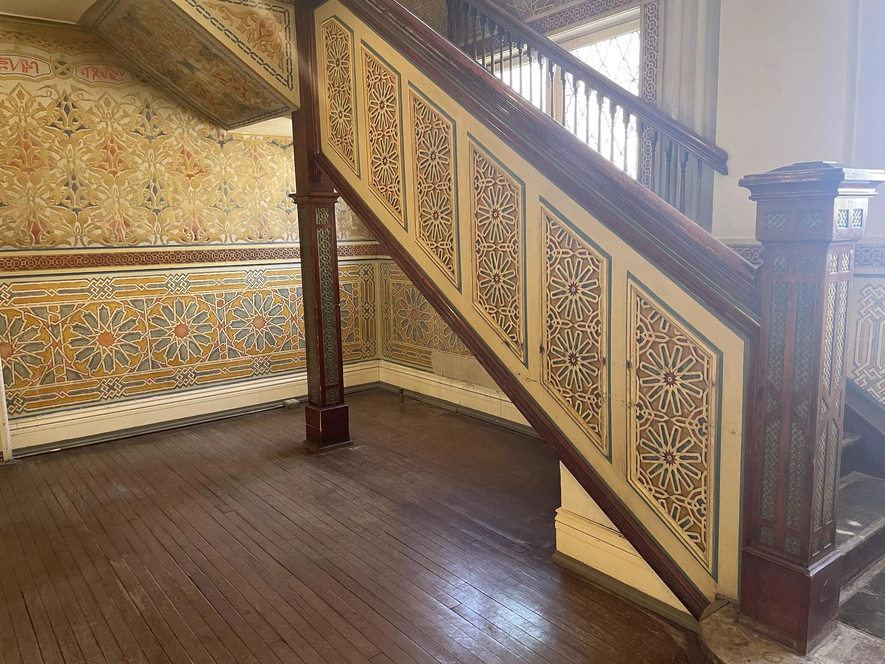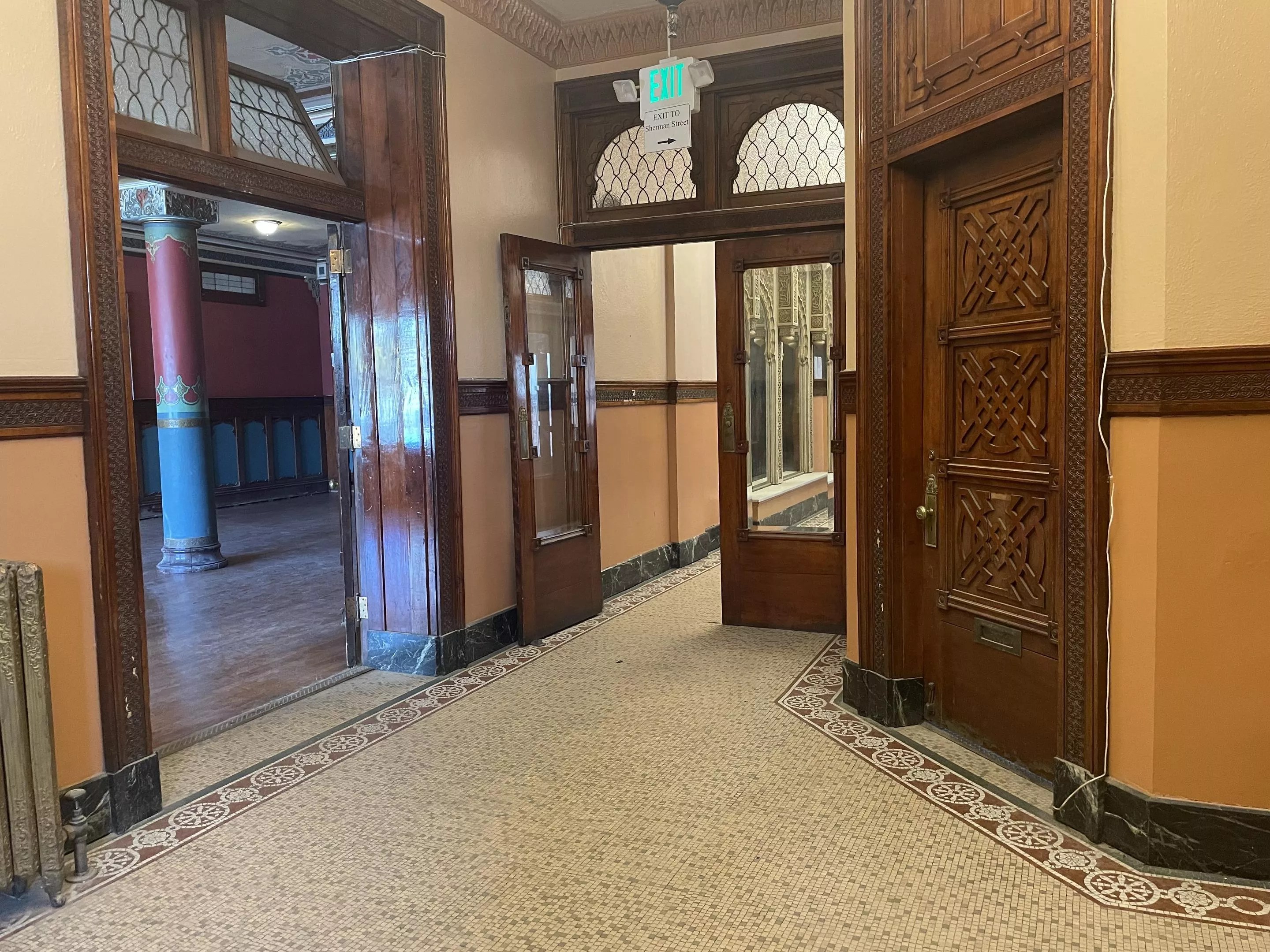 The space is now a visual marvel, with everything from the floors to the windows to the ceilings exhibiting careful detail and craftsmanship. Probasco says the Shriners, having branched off from the Masons, were able to infuse the space with custom door handles and inscriptions over the doorways on the first floor themselves.