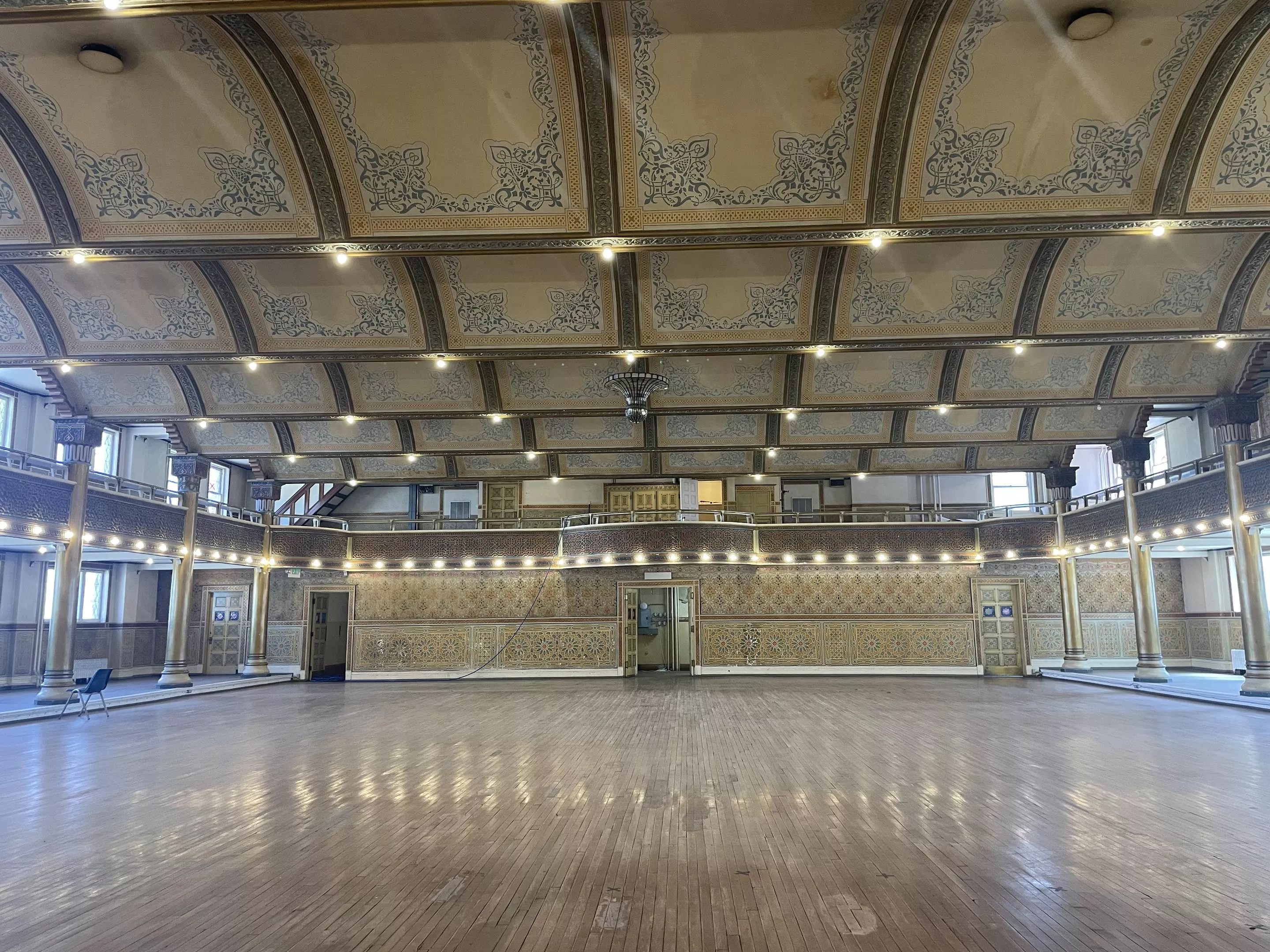 On the second floor of the building is the ballroom, where the Alhambra-style architecture transports people into a magical world with a scalloped ceiling and balcony that wraps around the entire space, taking up both the second and third floors.