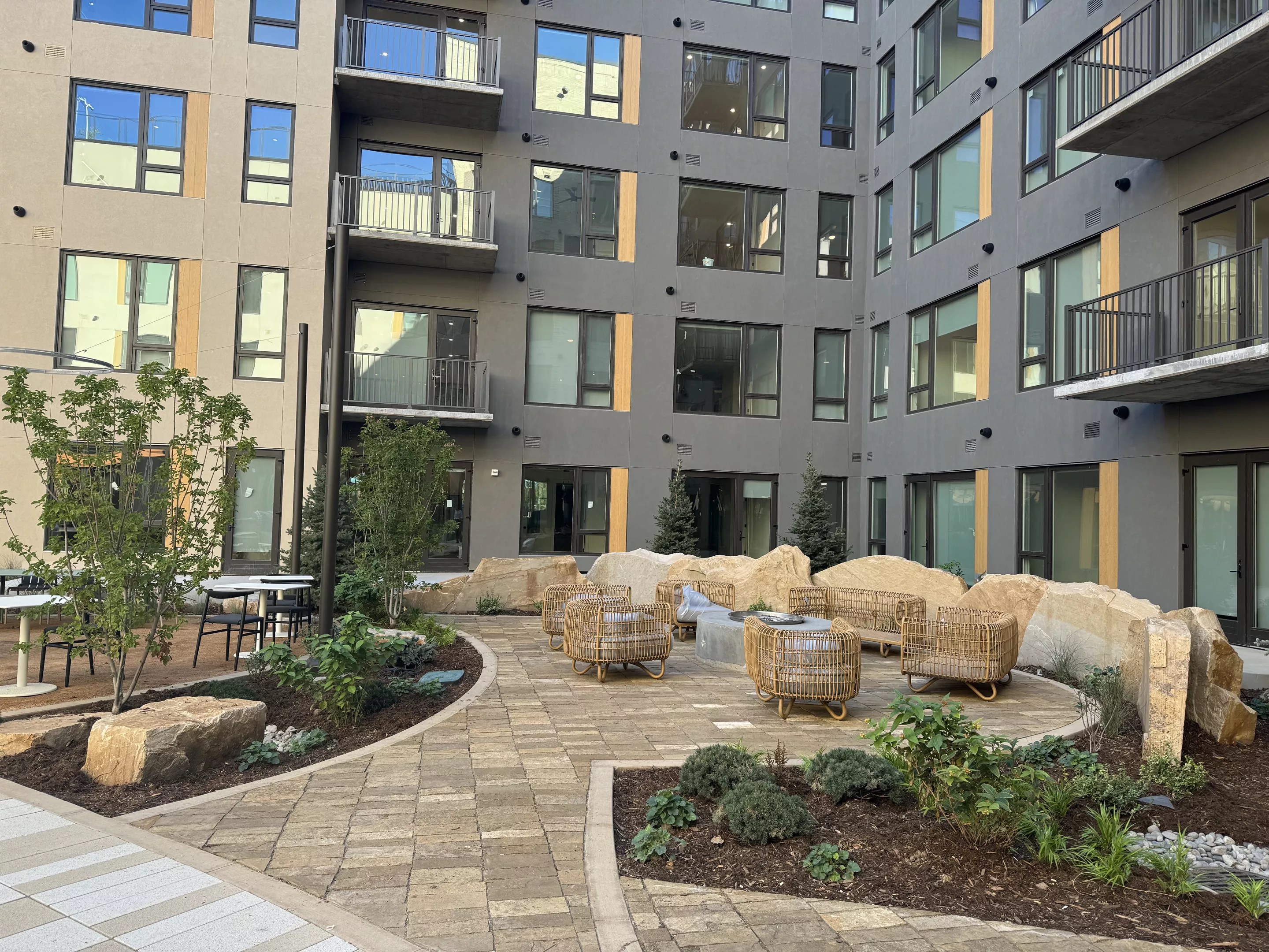 Amenities include a half-acre zen garden in the central courtyard of the property, which has a fire pit area made of stones from a local Colorado quarry. Though there isn’t an exterior plant feature like at One River North, Loseke says there are over 6,000 different plants throughout the property.