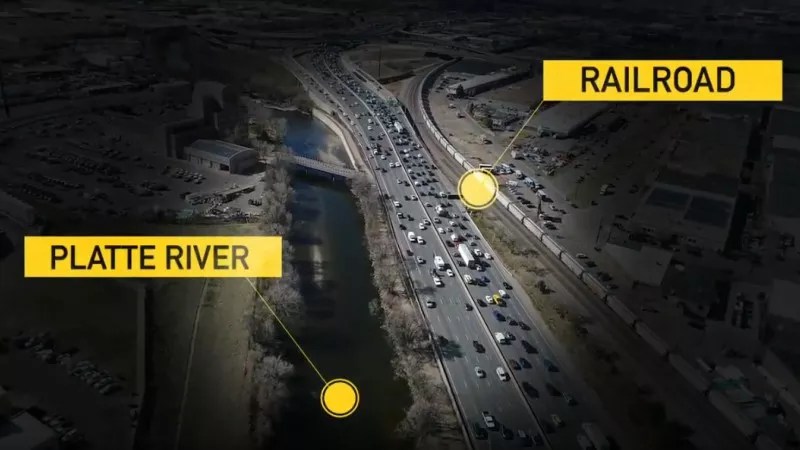 Problem is, the space needed for expansion is severely limited because the highway is pinched between Union Pacific railroad tracks on one side and the South Platte River on the other, as seen in this CDOT photo-illustration.
