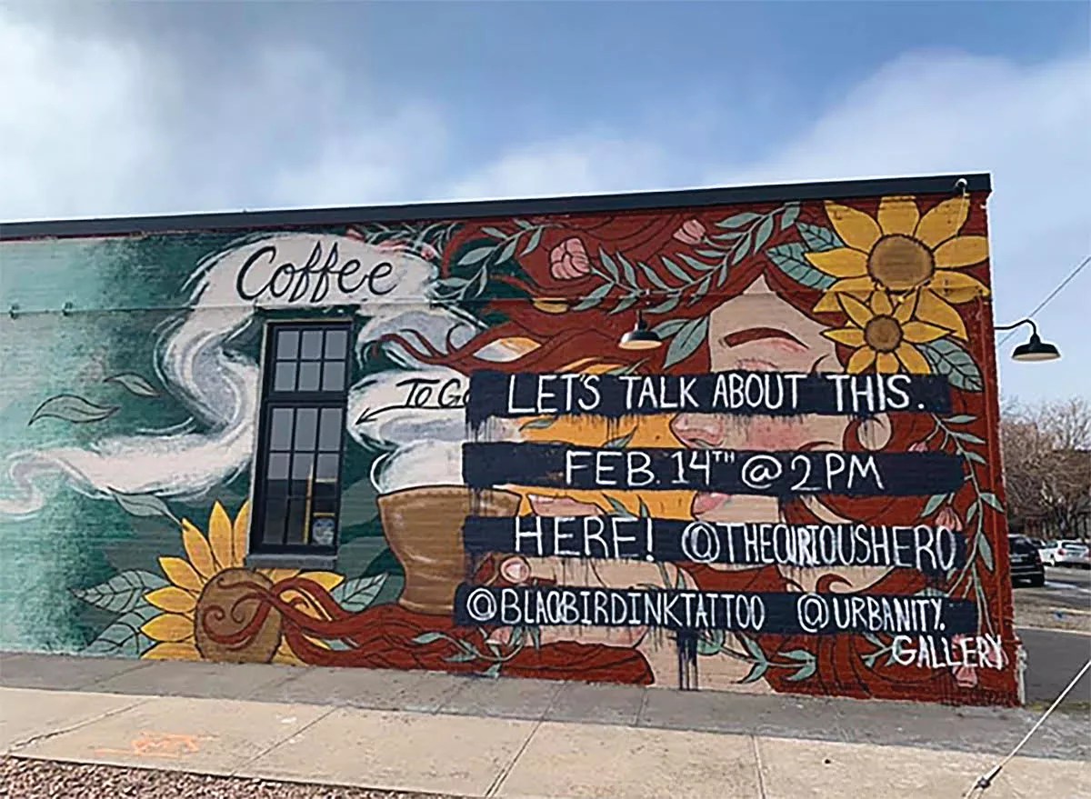 In 2020, the new owners had a mural painted on the wall: a lady with flowers in her hair, holding a steaming cup of coffee. That mural, the first by Blackbird Ink Tattoo, lasted only a short while before being graffitied. Over that graffiti was painted an invitation: “LET’S TALK ABOUT THIS.”