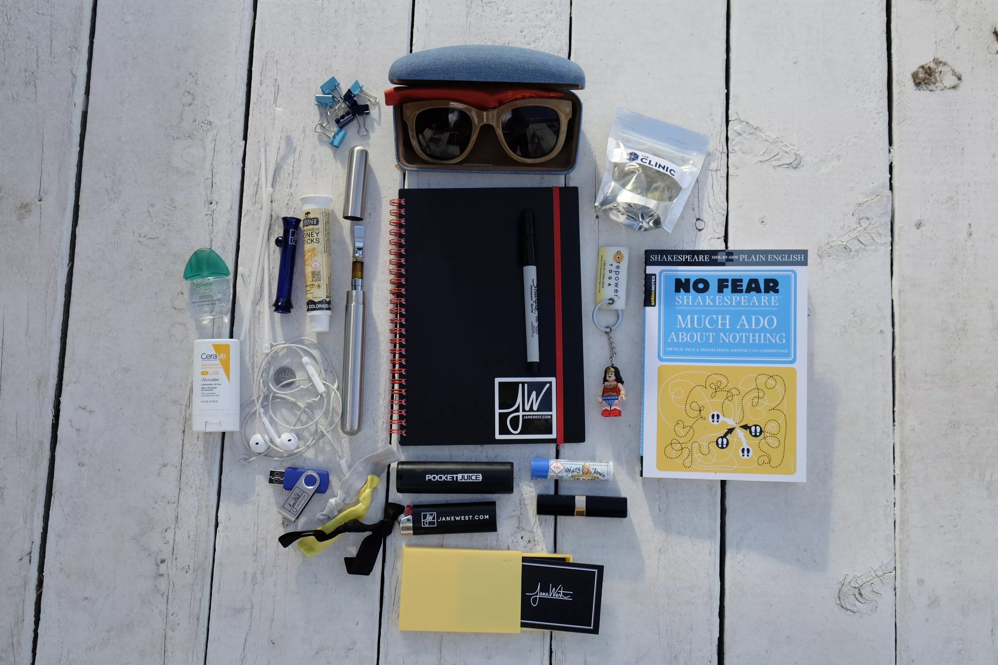In addition to the custom Jane West lighter and jump drive, West carries binder clips for her kids’ paperwork and pull ties. She also has eyedrops and sunscreen. The eyedrops whiten and cool your eyes; after a late night of work, she’ll use a few drops before taking her kids to school. The sunscreen is a zync-based stick. It goes on white and stays white until you rub it in, which is perfect when trying to apply it to two rowdy boys, she says: “I can see where it’s going, so I know my kids faces are totally covered.”