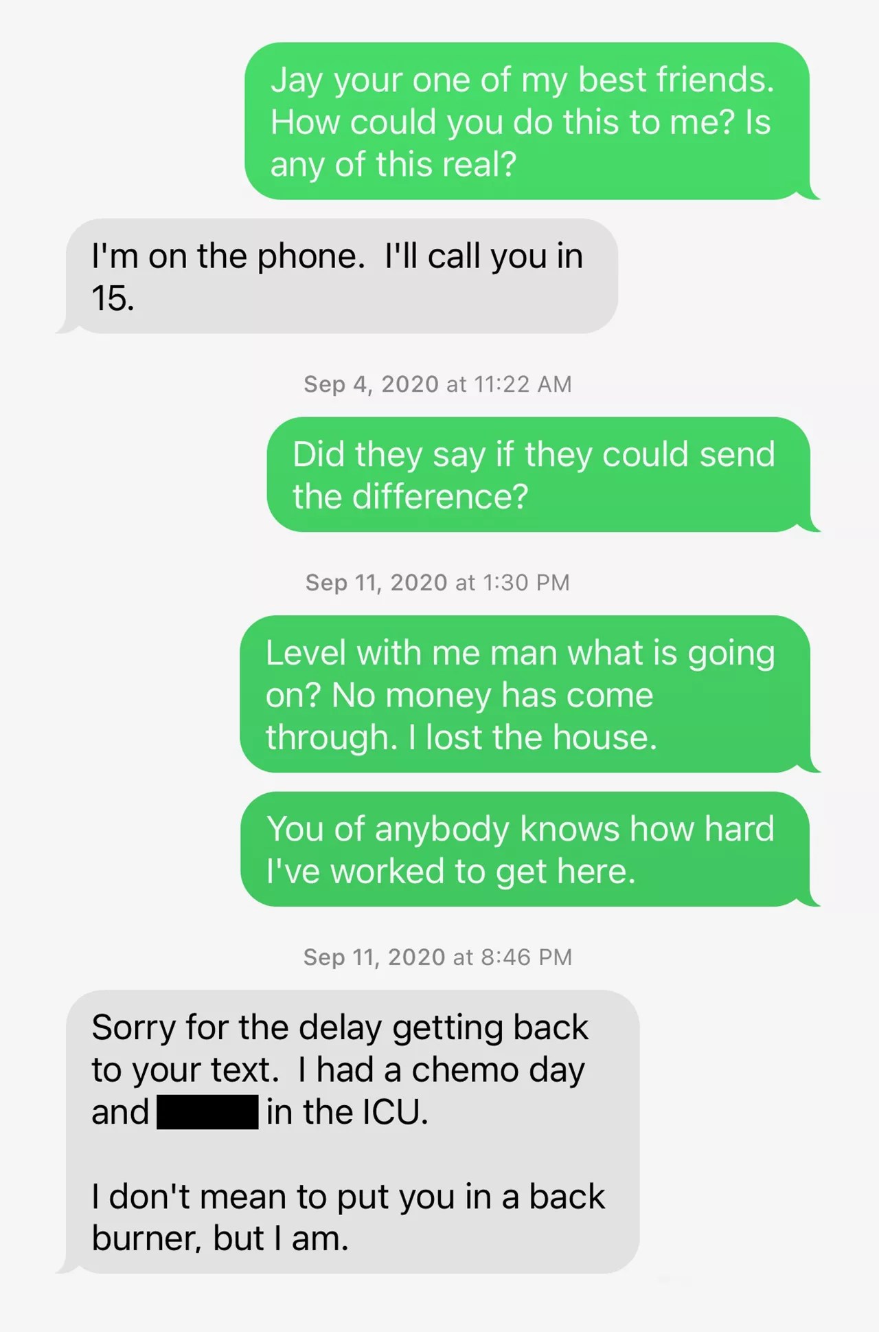 Stoots: “I don’t know if you’re mad at me or what’s going on man but I’m really concerned I’m gonna lose the house. My bank is saying ACH transfers only take 1-2 business days. And they would see if it attempted to come through. Can you please check on it?