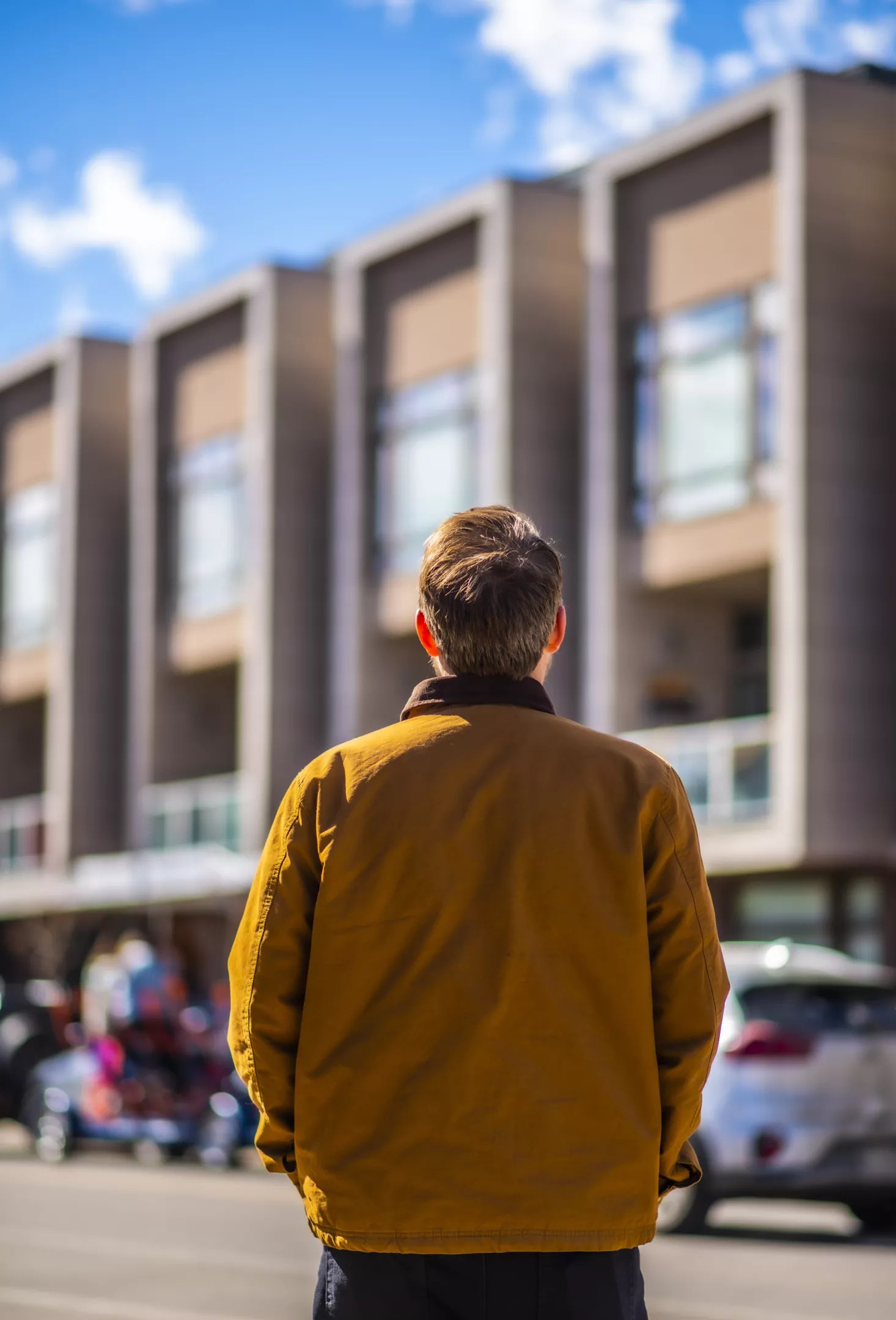 Jared Stoots looking up Larimer Street at the townhouse where Jason Lobins lives.