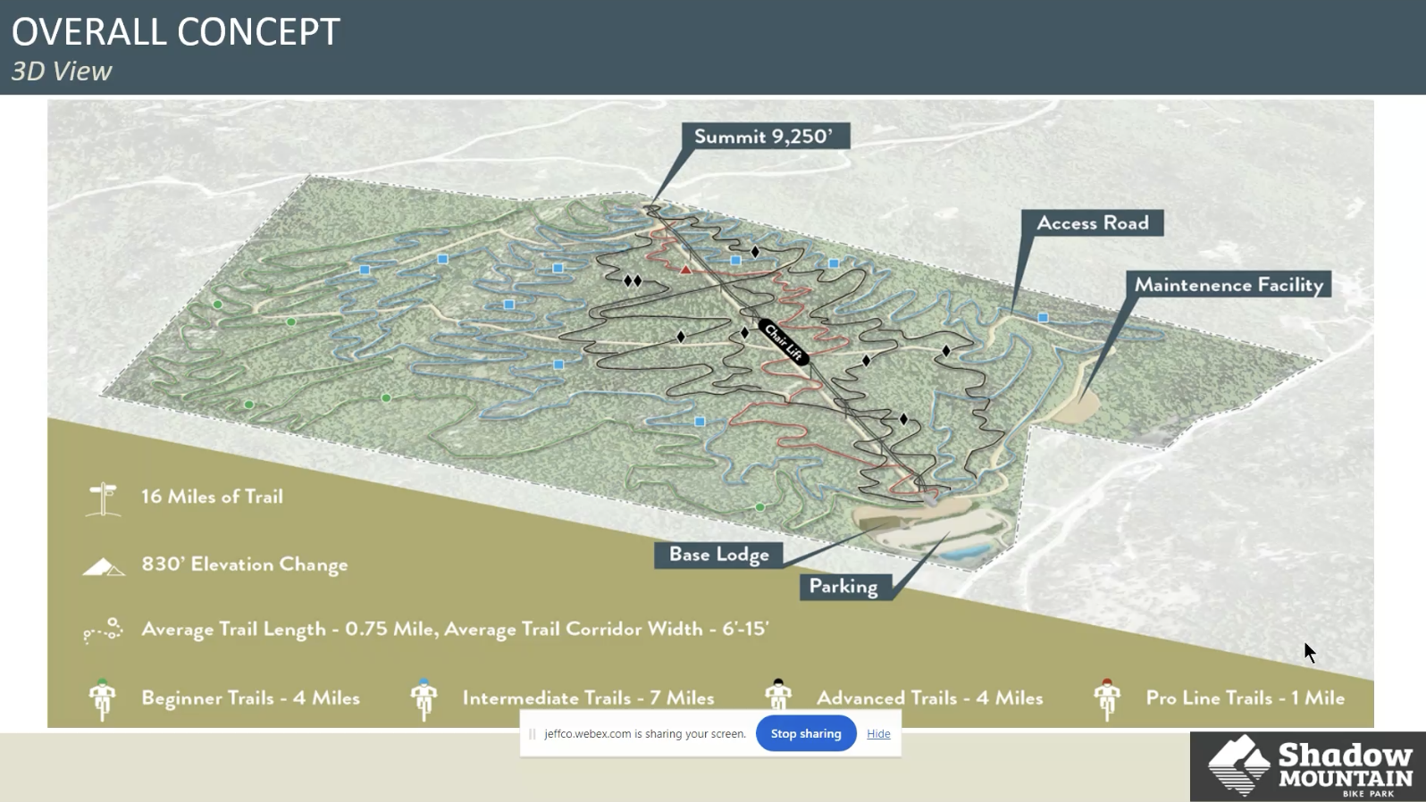 Their vision for Shadow Mountain Bike Park: sixteen miles of trails for skills ranging from beginners to professionals, with resources like bathrooms and flat tire repairs but keeping facilities generally uncomplicated. The chair lift would be brand-new, all-electric and only emit as much noise as a washing machine, according to the developers. A lodge and parking lot would be added, as well.