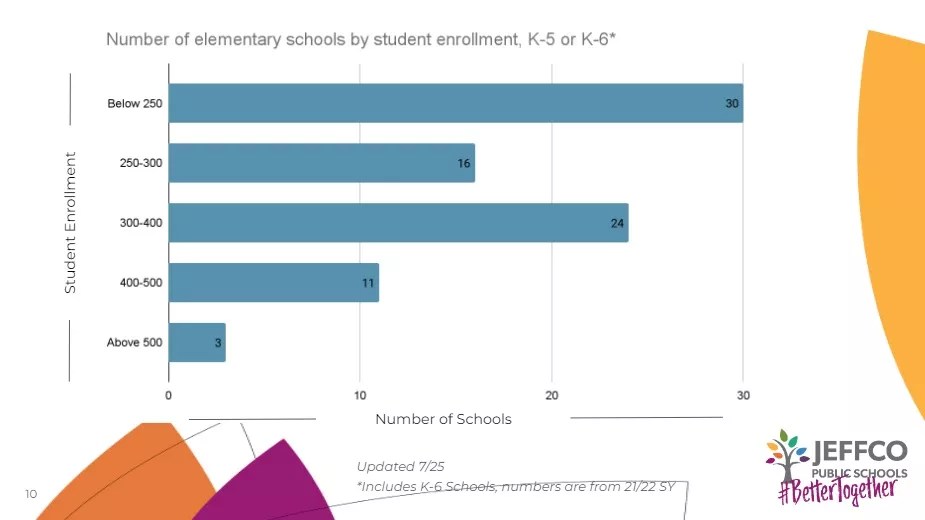Enrollment figures for the 2021-22 academic year are particularly worrisome. While Jefferson County could have provided education for 39,900 K-5 students in 85 traditional elementary schools over that span, only 25,600 were enrolled. Additionally, 49 elementary schools, representing 58 percent of the total, had a “student population under 250 and/or a building utilization of 60 percent or less,” another slide notes. “Combined, they have 10,600-plus empty seats.”