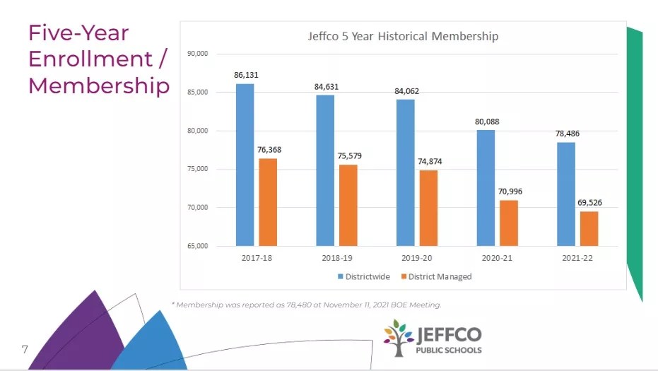 Right now, Jeffco has the “capacity to serve 96,000 students in traditional district-managed schools,” one slide notes, “and we currently serve 69,000 students in these schools.”