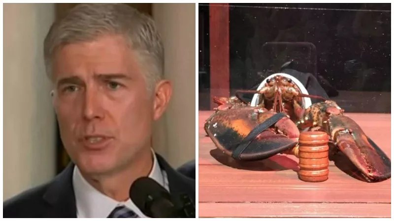 How so? “As you may know,” Oliver continued, “we have an all-dog Supreme Court to re-enact oral arguments, since cameras aren’t allowed in the courtroom…. Technically, we should be finding a dog for Gorsuch now, but we’re not going to do that. Instead, to reflect the fact that Gorsuch’s nomination is a historical aberration, he will be getting an animal that will constantly remind us that it has no place in that spot on a dog court. What I’m saying is, Gorsuch is getting a lobster. That’s right: We’re going paws and claws up in this piece!”