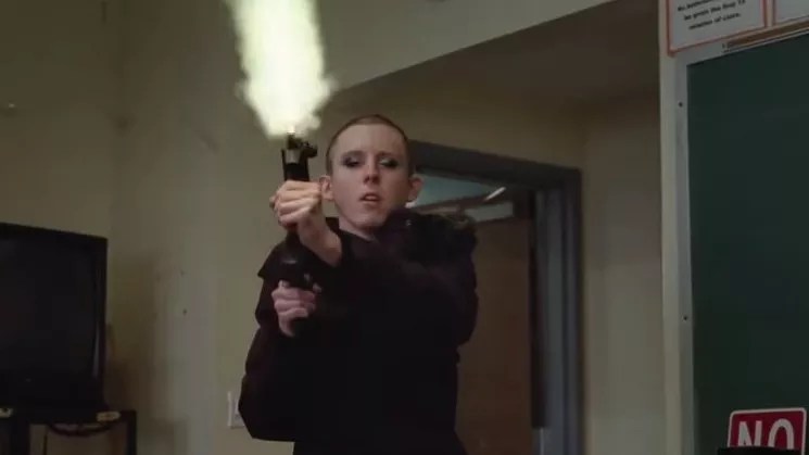 The school shooter in Vox Lux wears a long coat of the sort associated with the Columbine killers.