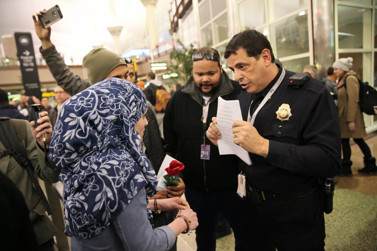 The protest’s organizers say they did look into obtaining a permit beforehand, but were told by DIA officials that the airport requires seven days to consider any permit requests. According to Amal Kassir, the Syrian slam poet who led the demonstration, one of her friends had called the airport early on January 28 to request a permit. At first the airport official who answered the phone said that it needed two days to consider the request, then revised that number to seven days, they say.
