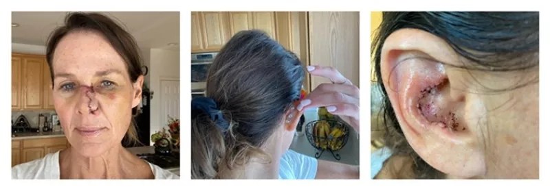 (From left) A Kathy Sabine post-surgical photo sans bandage; a look at the bolts holding her ear together; the portion of her ear from which cartilage was taken.
