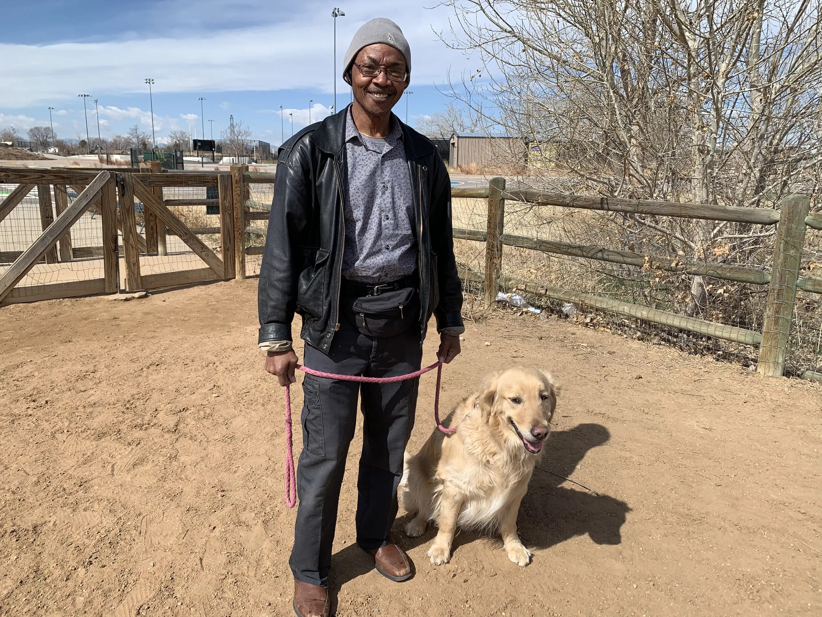 Kenny Cobbin has his dog, Cooper, on a string as he walks him along the quiet streets of Green Valley Ranch. Cooper, a mixed breed that presents like a golden retriever, responds promptly to all of Cobbin’s commands: sit, high five, come back.