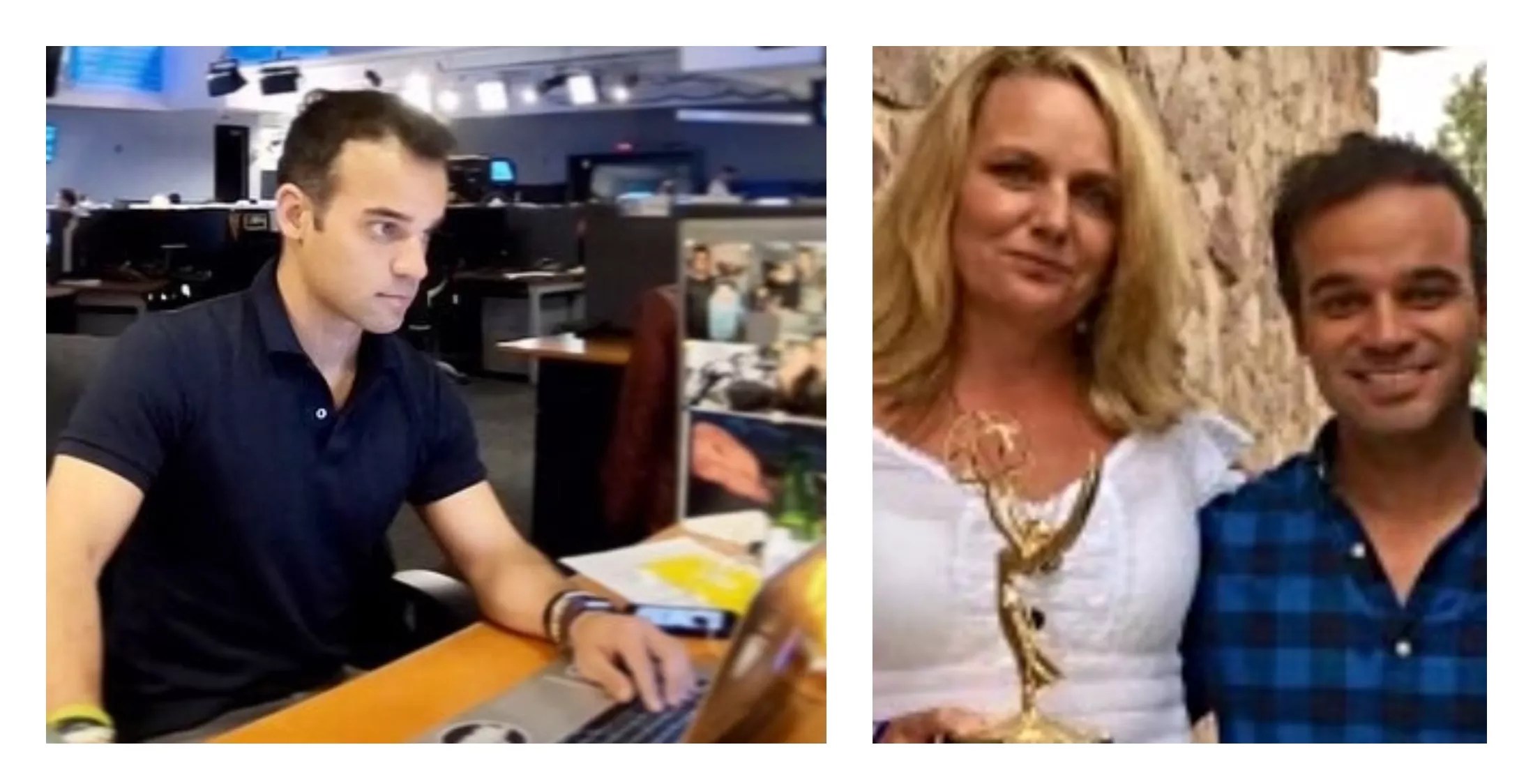 Kevin Torres in the newsroom and posing with Elaine Hall, Dylan Redwine’s mother, after giving her the Emmy he earned for covering stories related to her son’s murder.